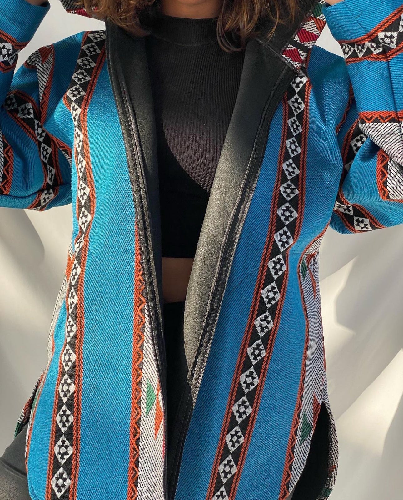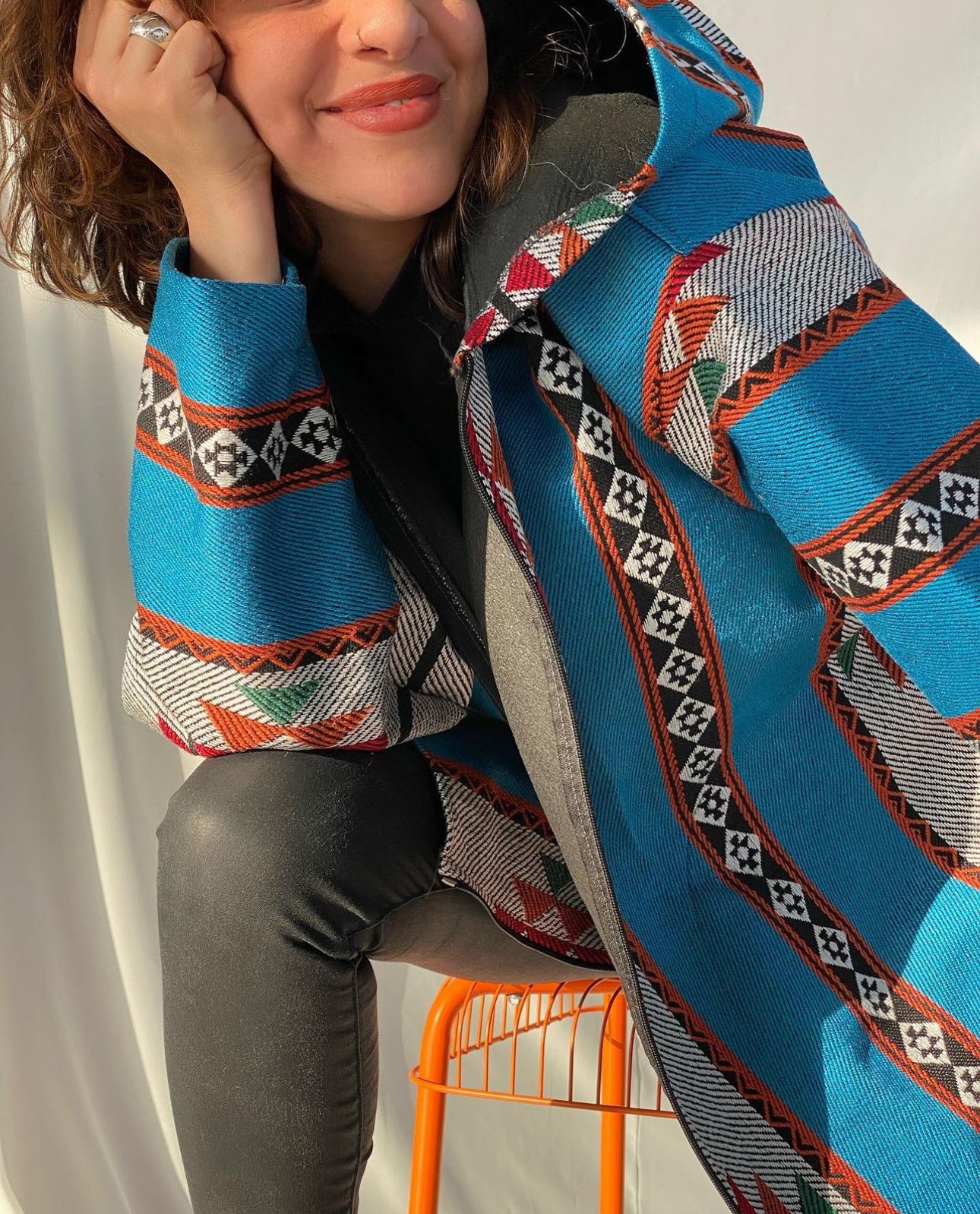 The Sama Full Zipper Jacket from Qashabeyyeh features a stylish split cut design in a captivating blue color. The vibrant shade adds a touch of elegance and versatility to this already remarkable jacket.