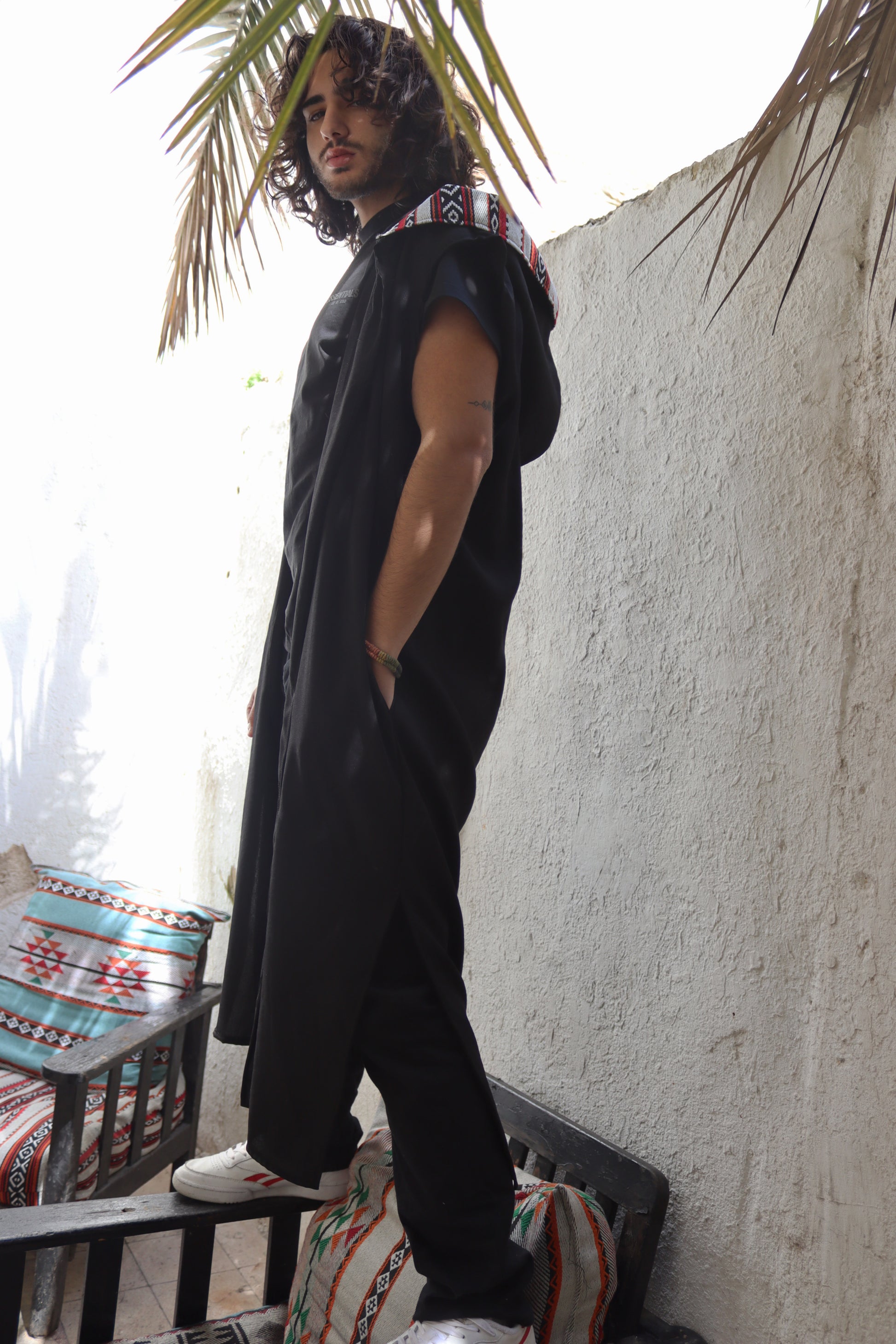 Step into the summer season with confidence and style with our Qashabeyyeh Creamy on Black Summer Vest. Crafted with meticulous attention to detail, this sleeveless, long-coat style vest is designed to elevate your wardrobe while keeping you cool and comfortable in the warmest of days.