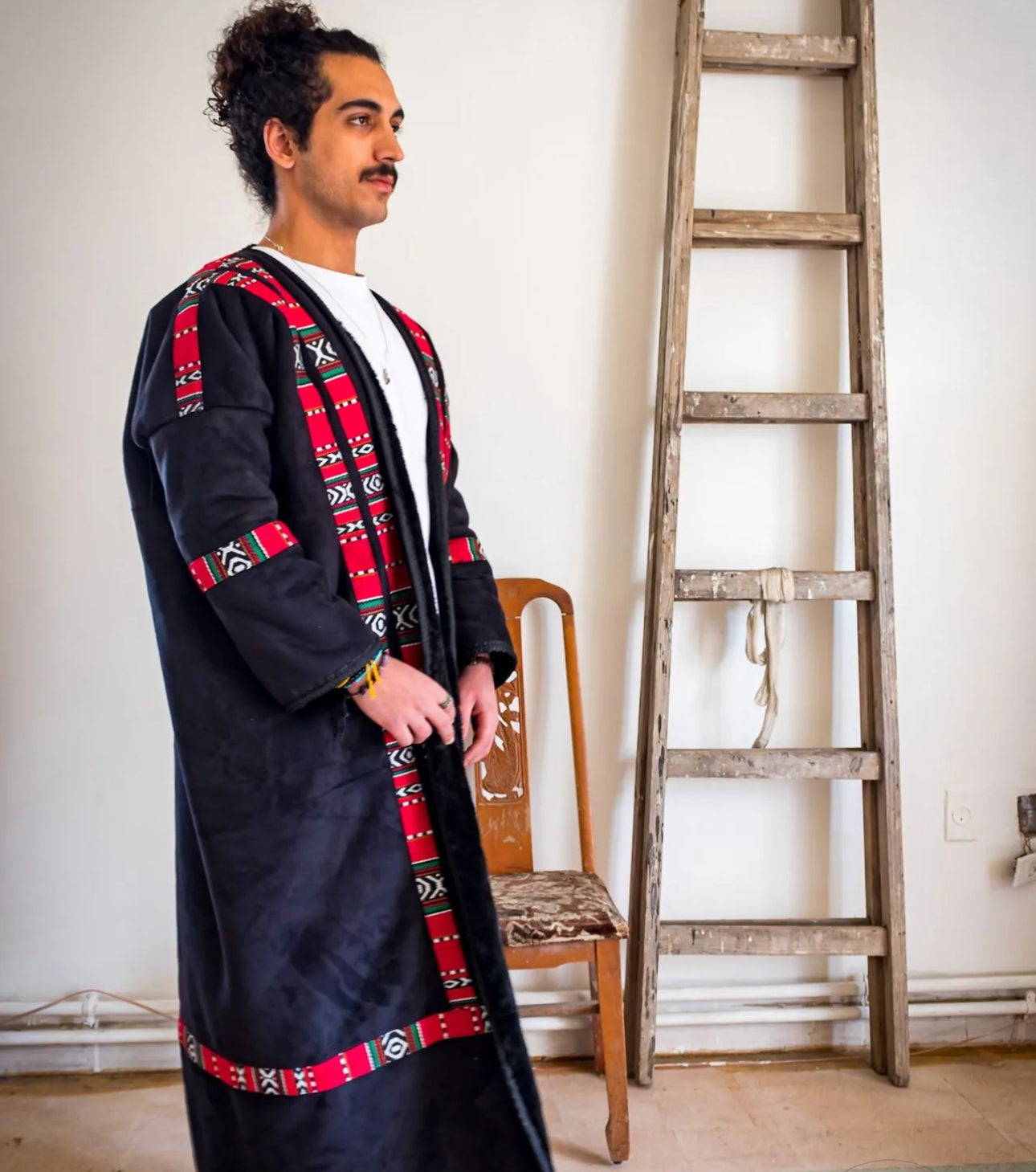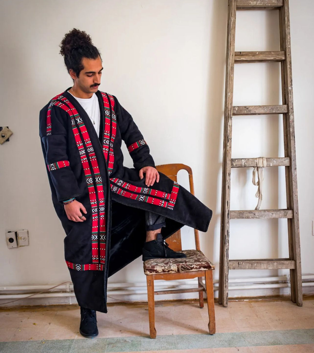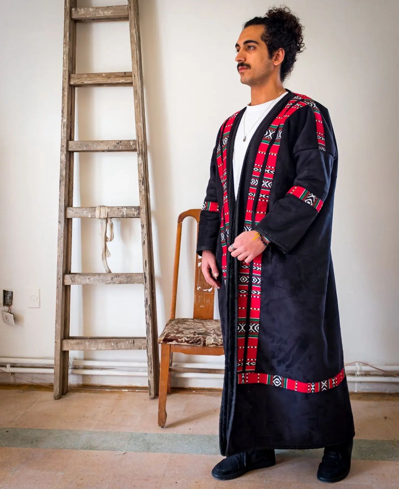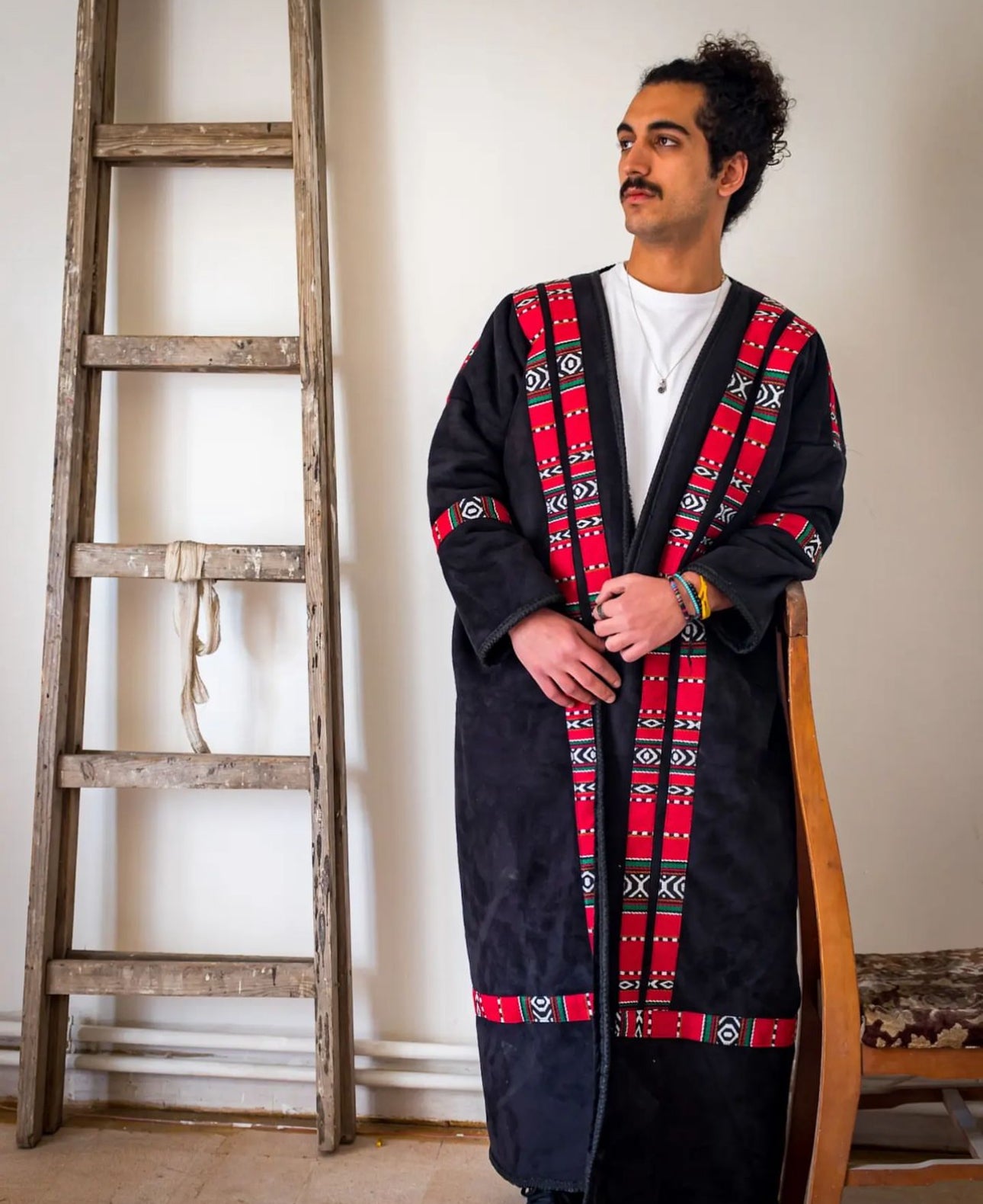 Introducing the Qashabeyyeh Jamer on Black Farweh: A Long Farweh Coat for Unisex Style and Comfort.