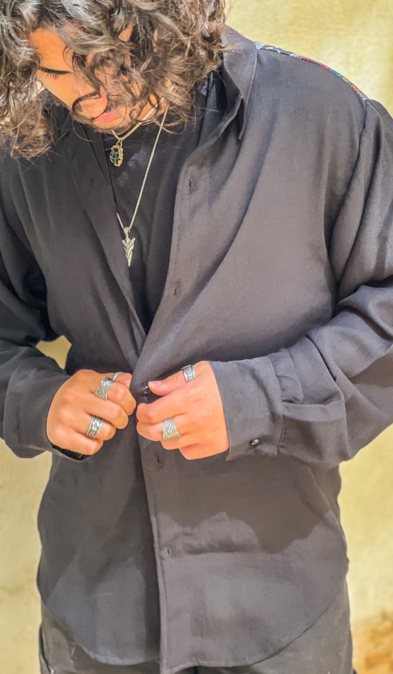 Elevate your style with the Qashabeyyeh Fahem on Black Shirt. Order this handmade shirt today and experience the perfect blend of comfort, style, and craftsmanship. Embrace the essence of Qashabeyyeh's designs and make a fashion statement that reflects your unique personality.