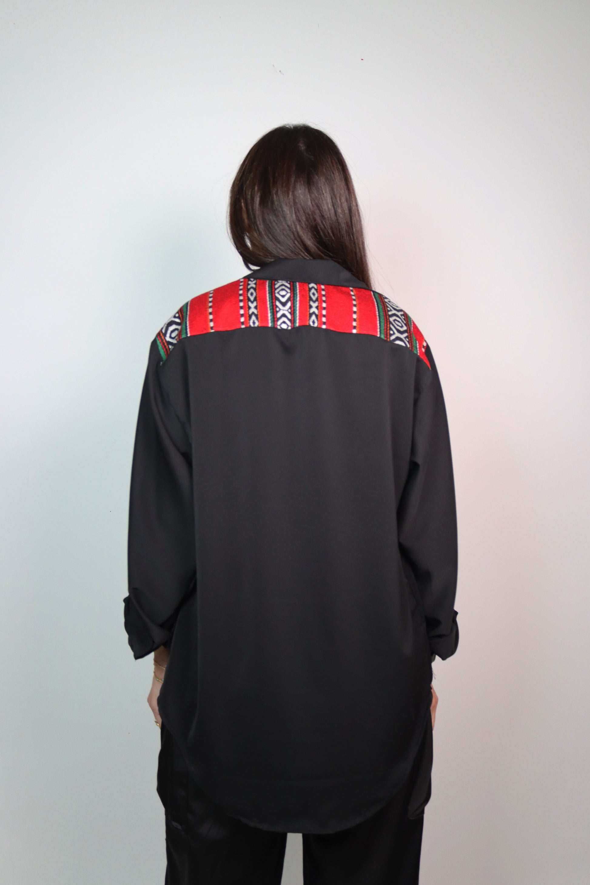 Elevate your style with the Qashabeyyeh Jamer strip on Black Shirt. Order this handmade shirt today and experience the perfect blend of comfort, style, and craftsmanship. Embrace the essence of Qashabeyyeh's designs and make a fashion statement that reflects your unique personality.
