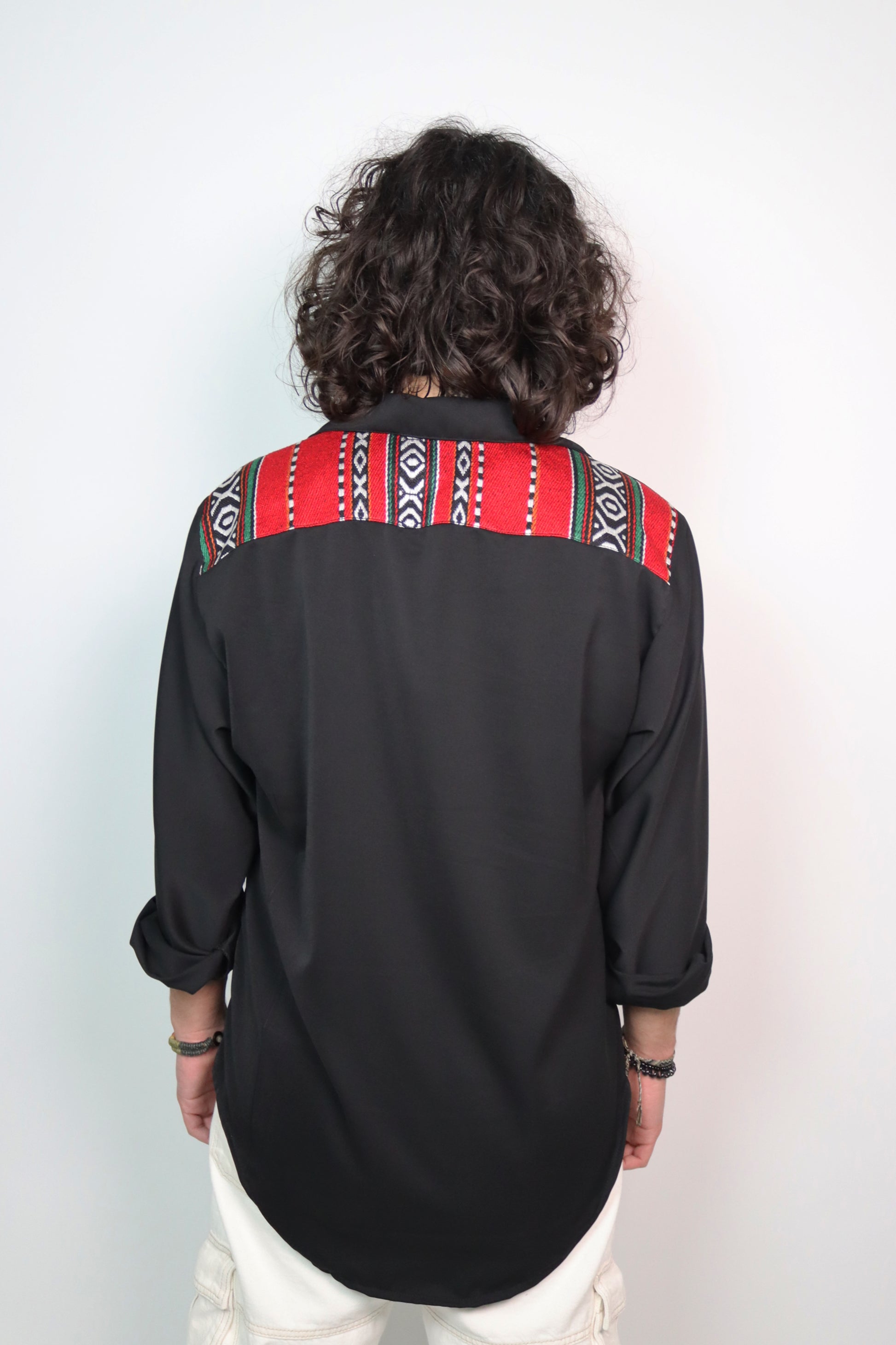 Jamer on Black Shirt by Qashabeyyeh is a stylish and versatile tee that combines comfort and style. Handmade with meticulous attention to detail, this shirt showcases exceptional craftsmanship.