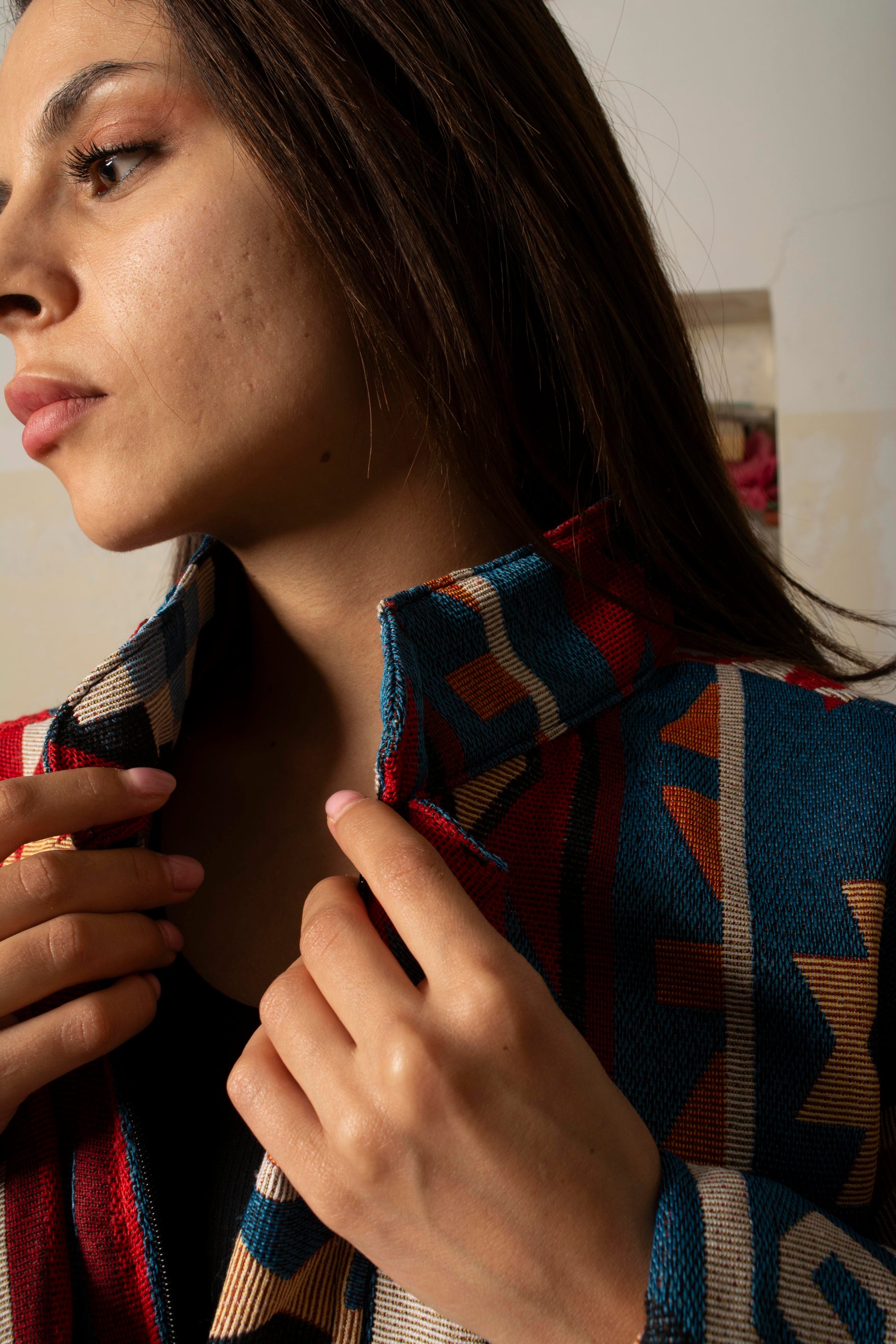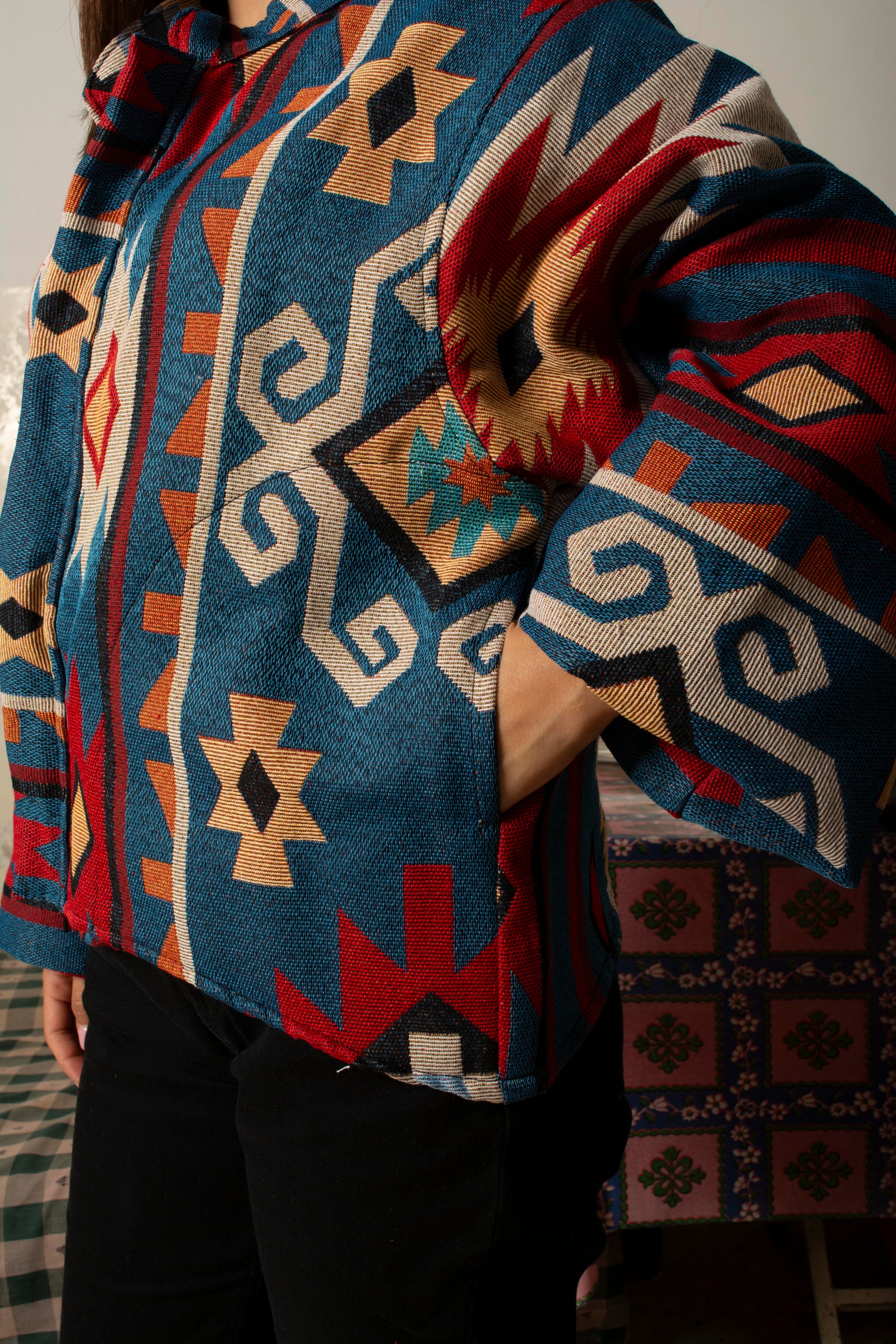 Make a statement with the Jiddi Cropped Jacket, featuring a blue base with fiery red accents. Its slide zipper, pockets, and Chinese collar create a bold, modern silhouette. All sizes available, designed to give every wearer confidence and style.