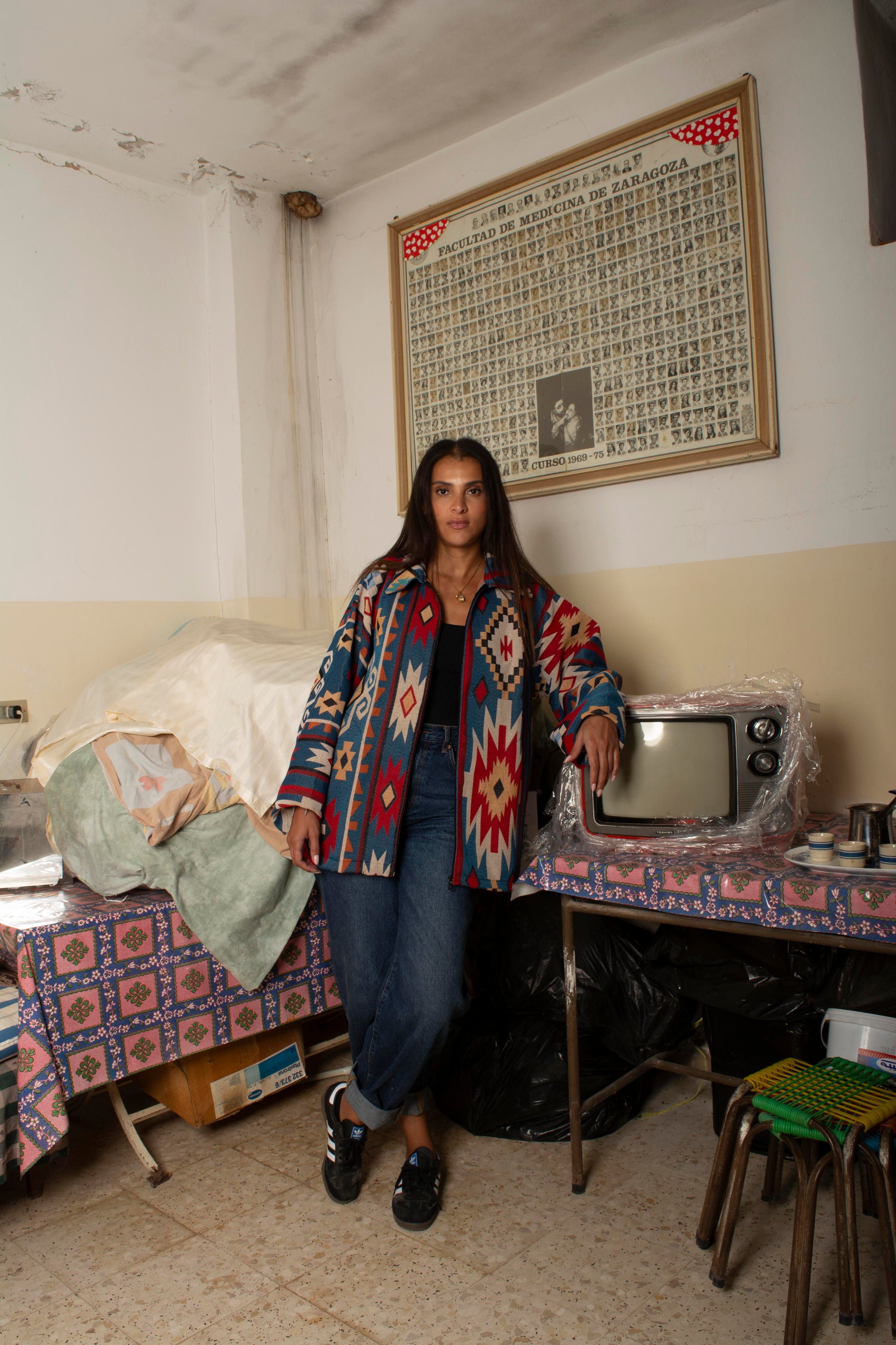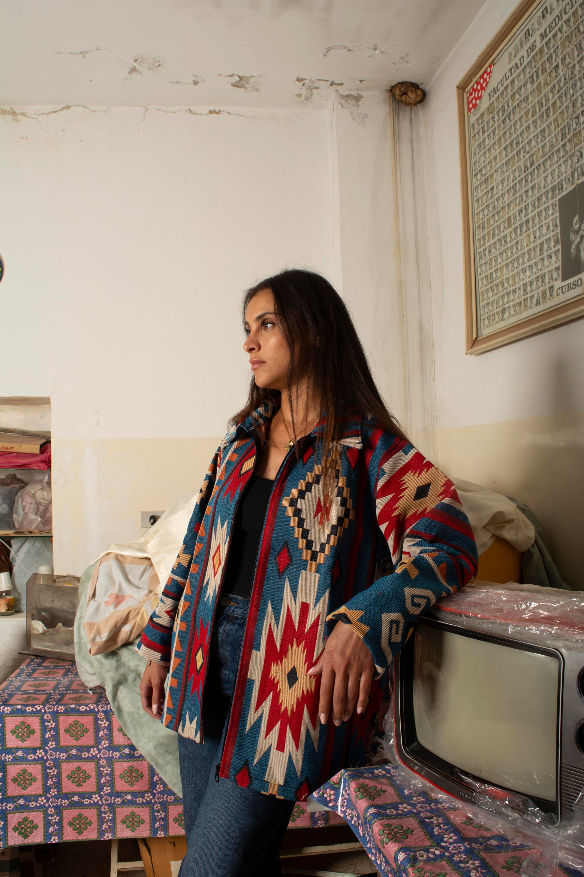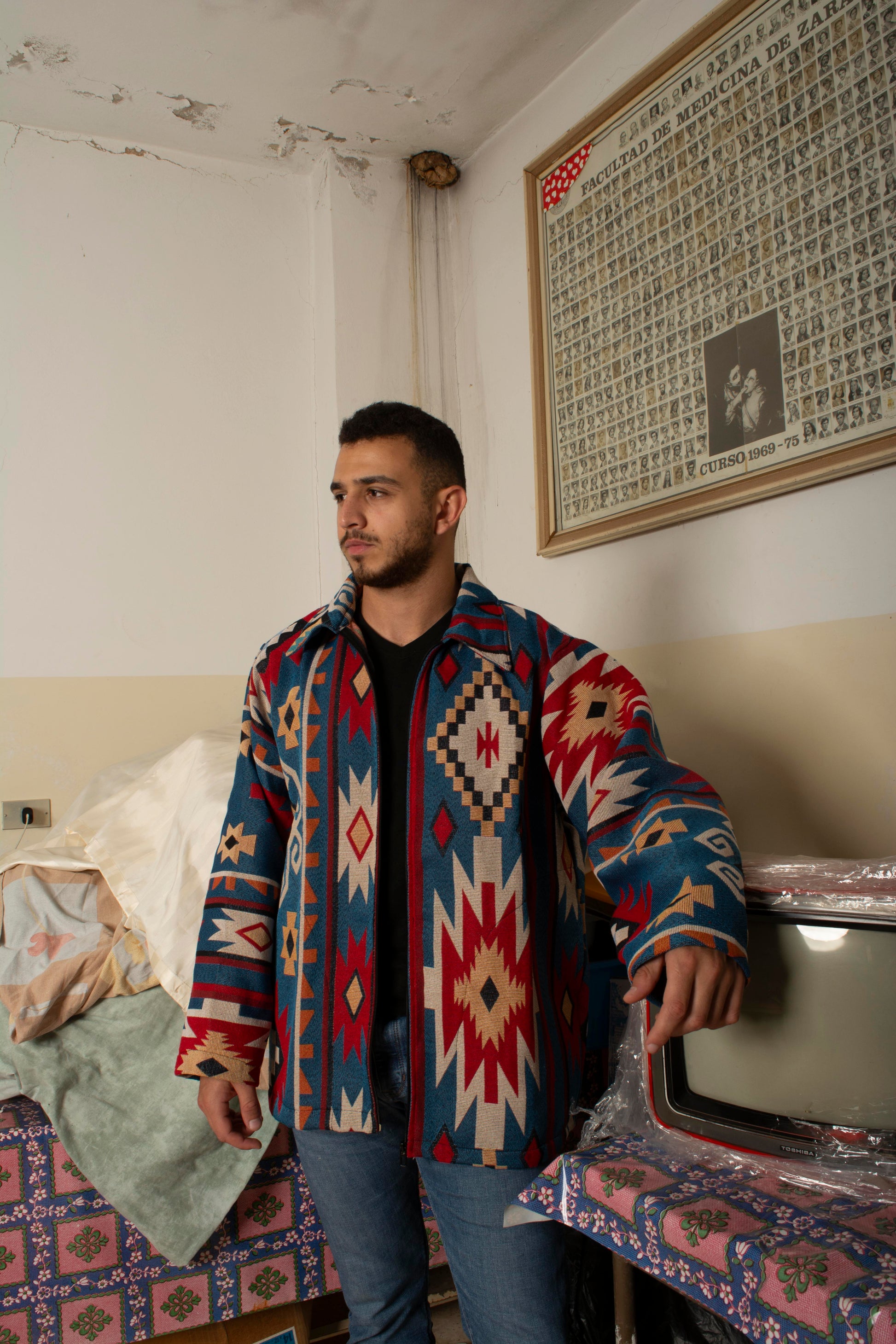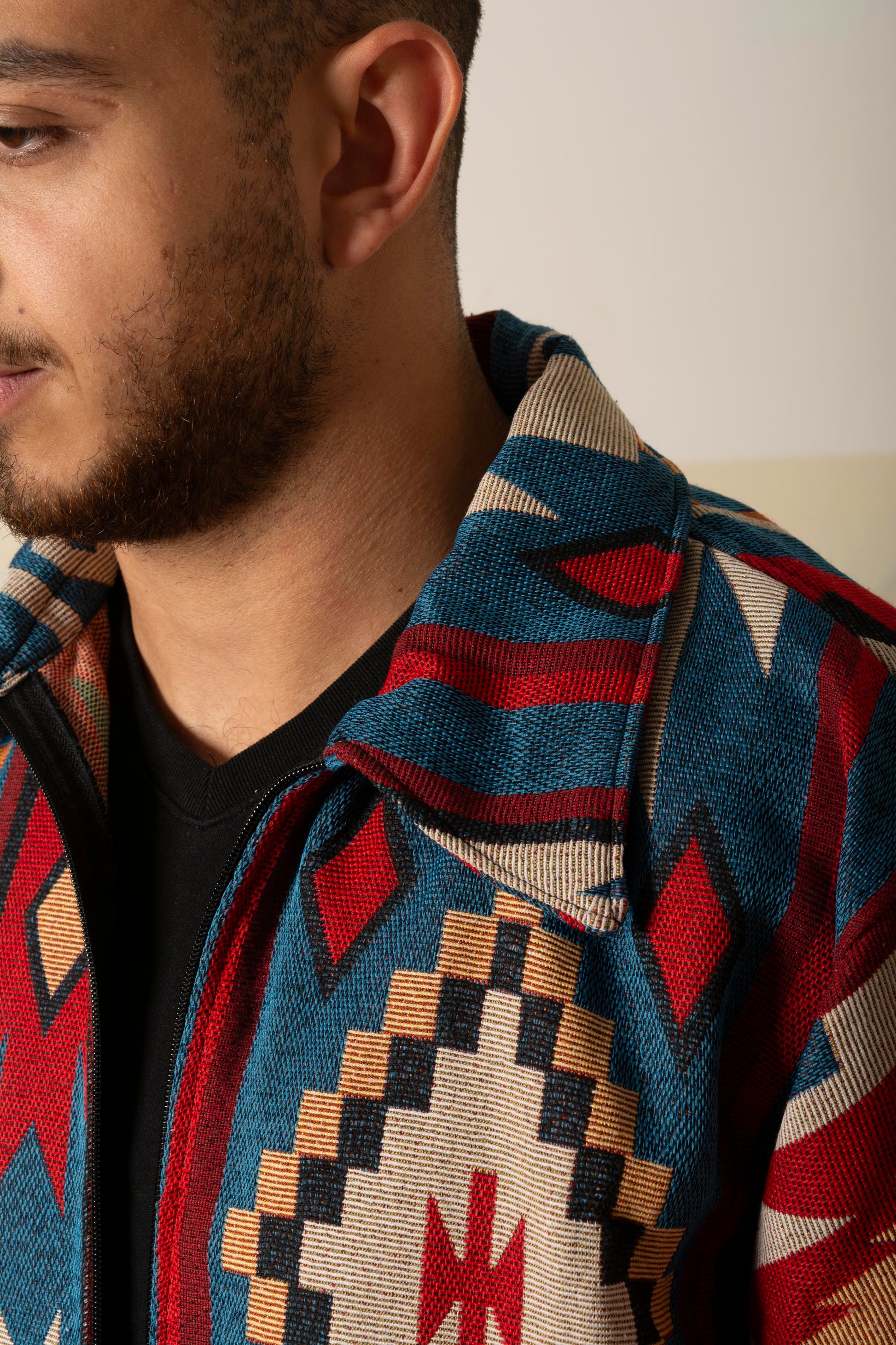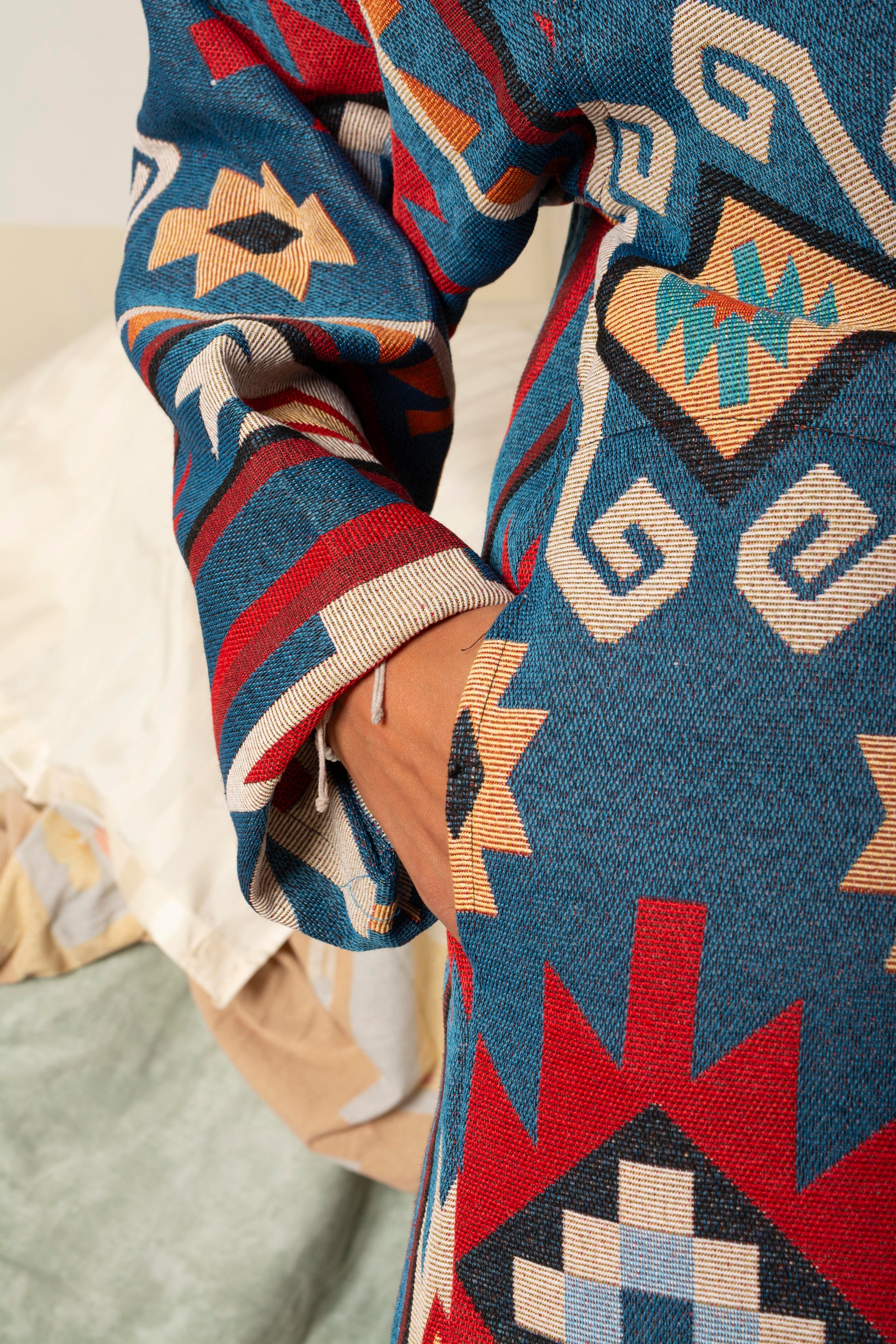 The Jiddi Jacket honors the enduring spirit and warmth of grandfathers. Its blue base reflects calm stability, while the red “fire” patterns symbolize energy, courage, and life passed through generations.