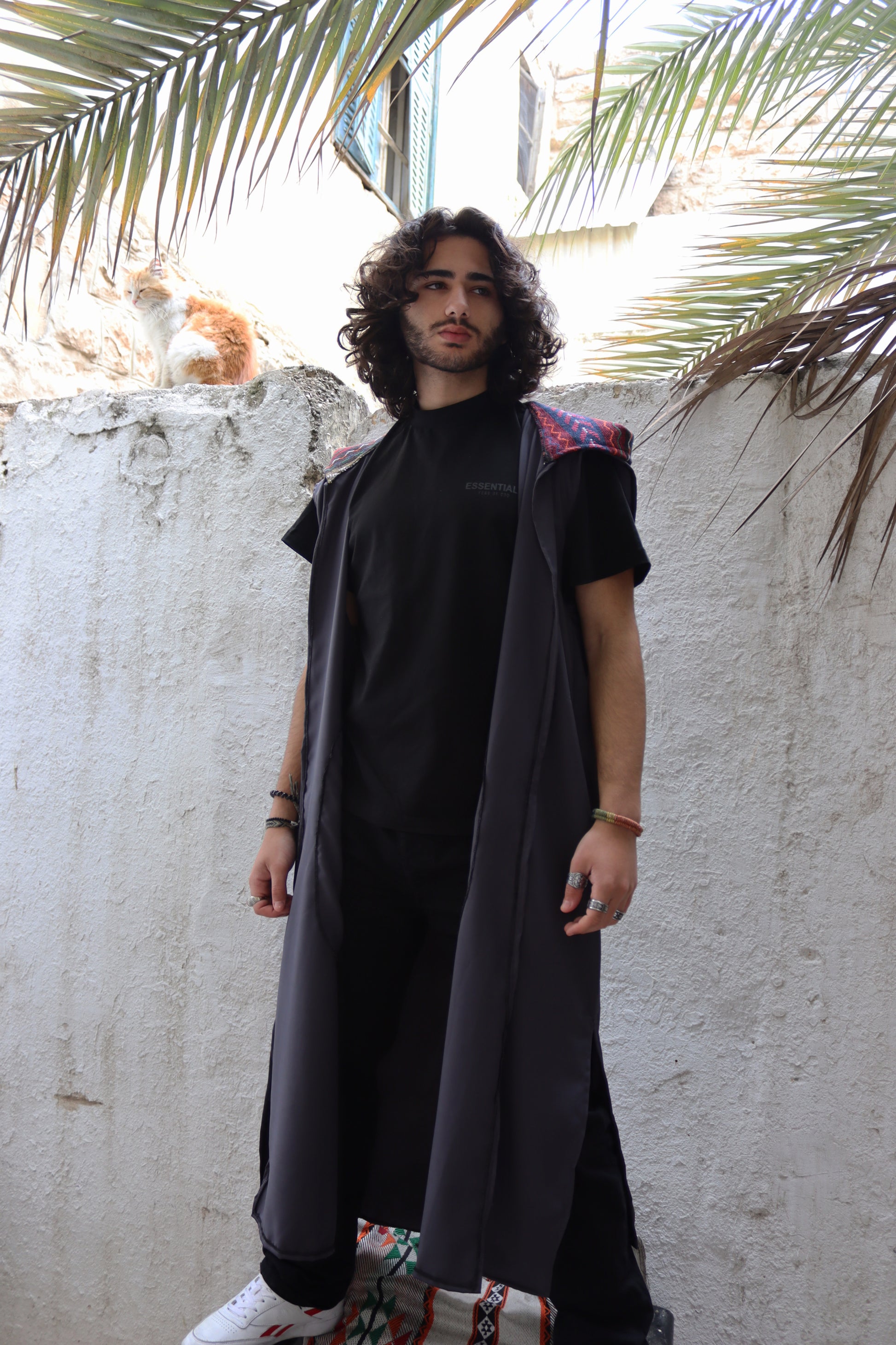 Step into the summer season with confidence and style with our Qashabeyyeh Marah on Grey Summer Vest. Crafted with meticulous attention to detail, this sleeveless, long-coat style vest is designed to elevate your wardrobe while keeping you cool and comfortable in the warmest of days.