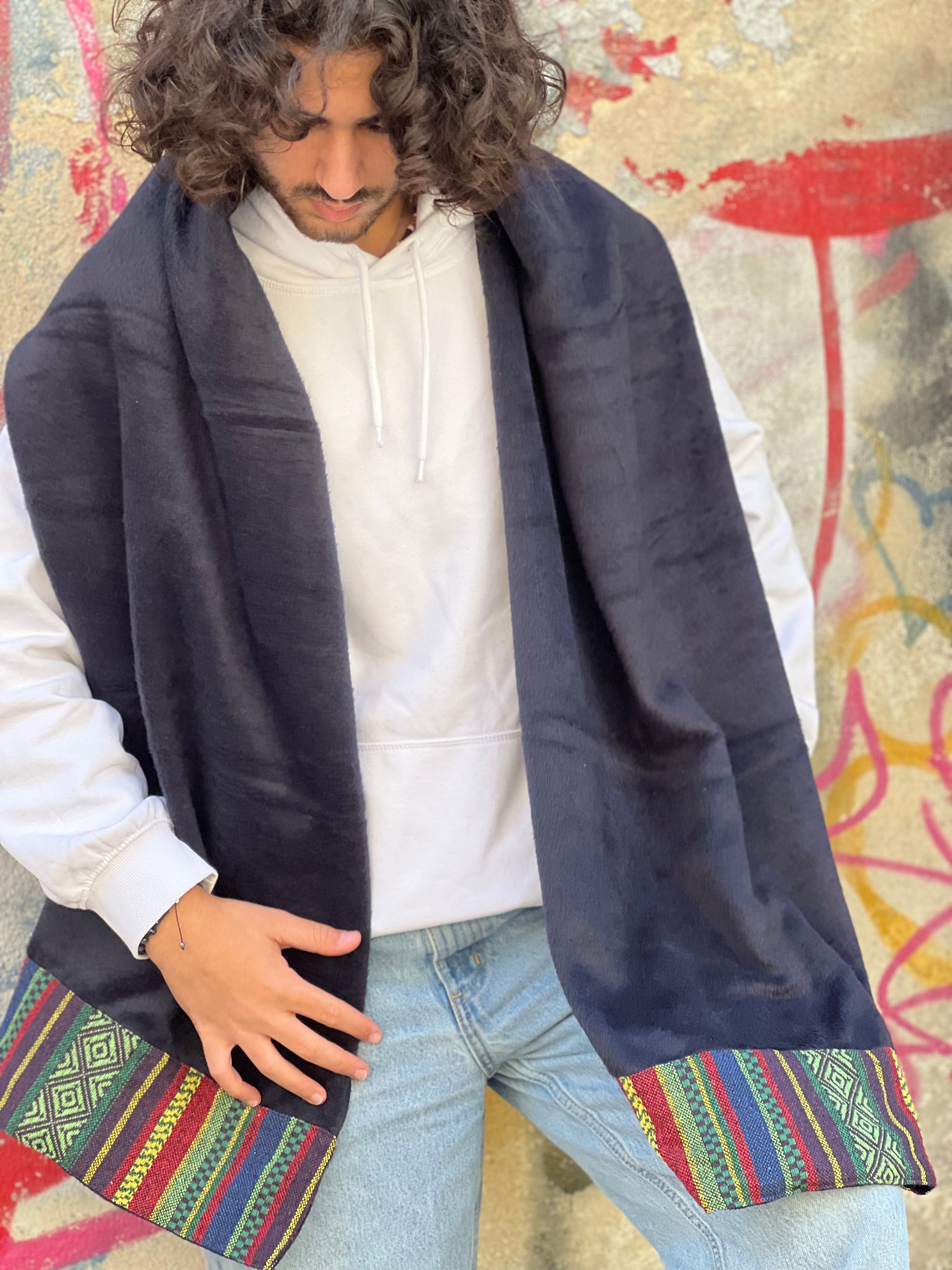 Introducing the Qashabeyyeh Nana'a on Navy Scarf - a captivating blend of traditional craftsmanship and contemporary streetwear style. Embrace the rich cultural heritage of the Arab world with this exquisite accessory, meticulously crafted to elevate your fashion game.