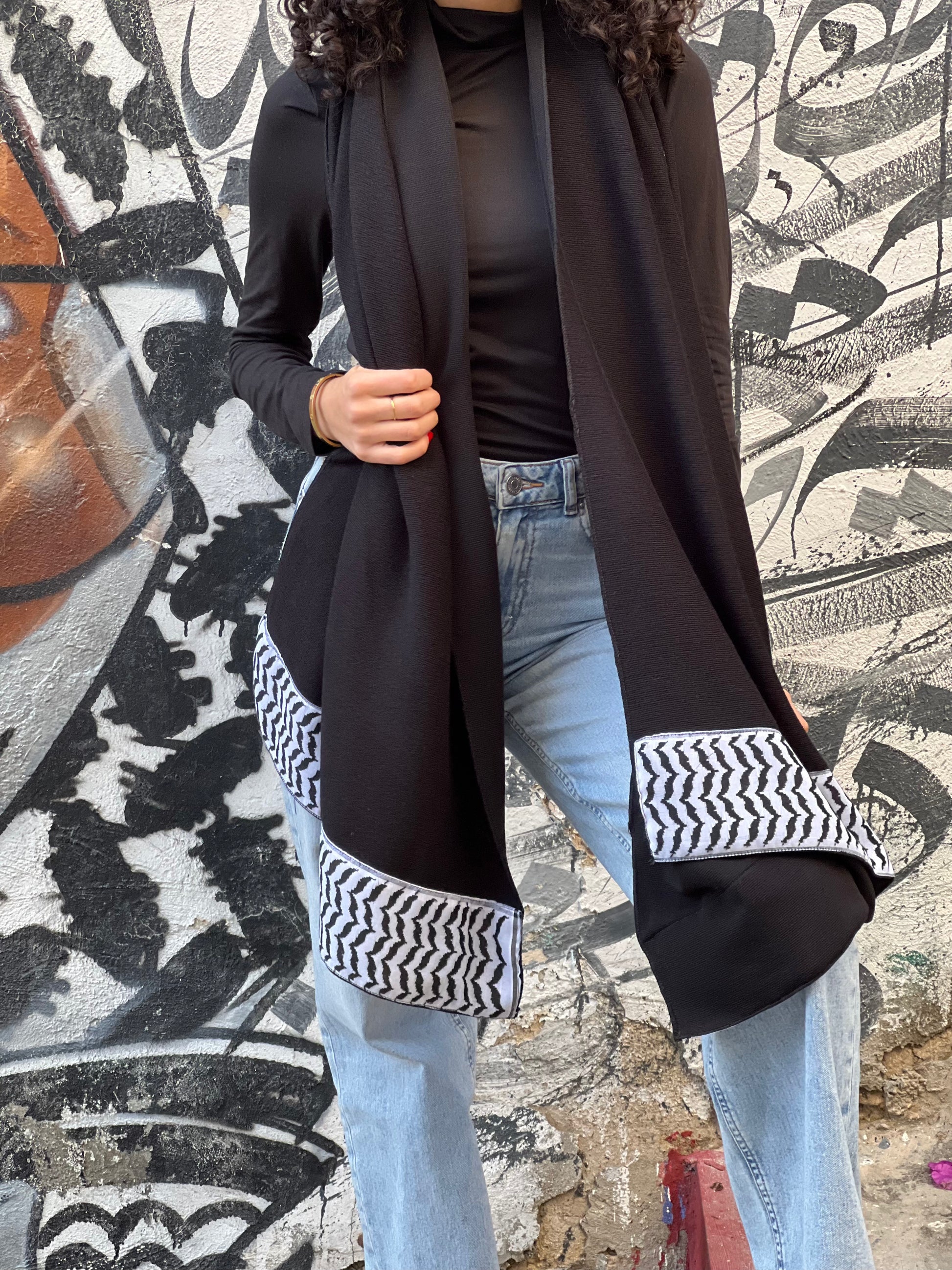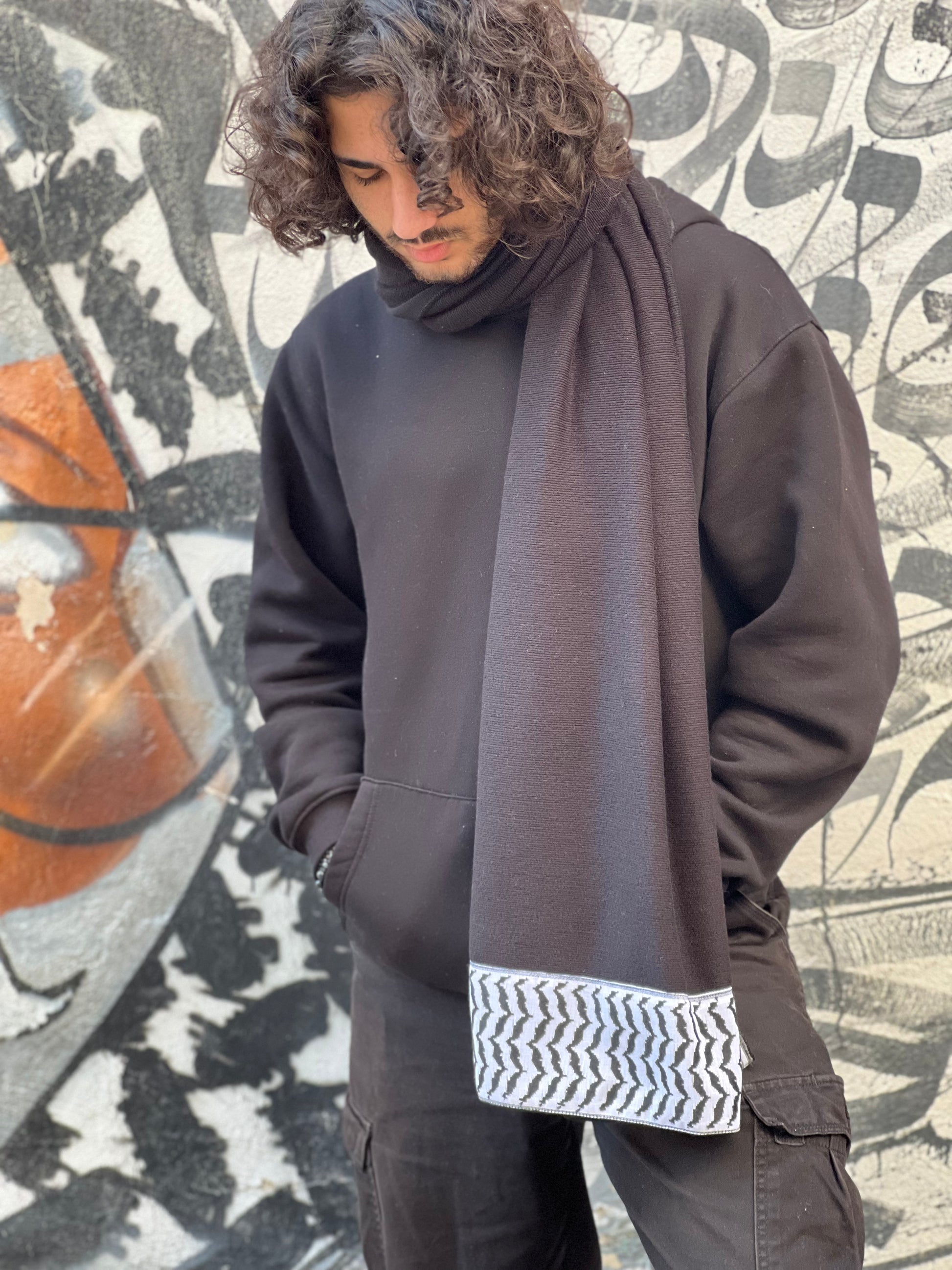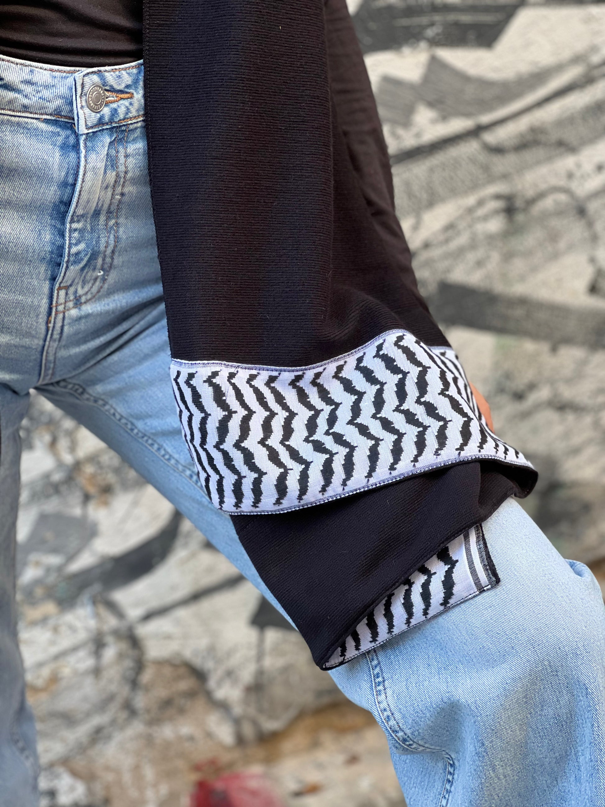 What sets this scarf apart is the incorporation of the Palestinian keffiyeh fabric, a beloved symbol of Palestinian identity and resilience. The intricate patterns and symbolic black and white design of the keffiyeh fabric add a touch of authenticity and cultural significance to the scarf, making it a powerful statement piece.