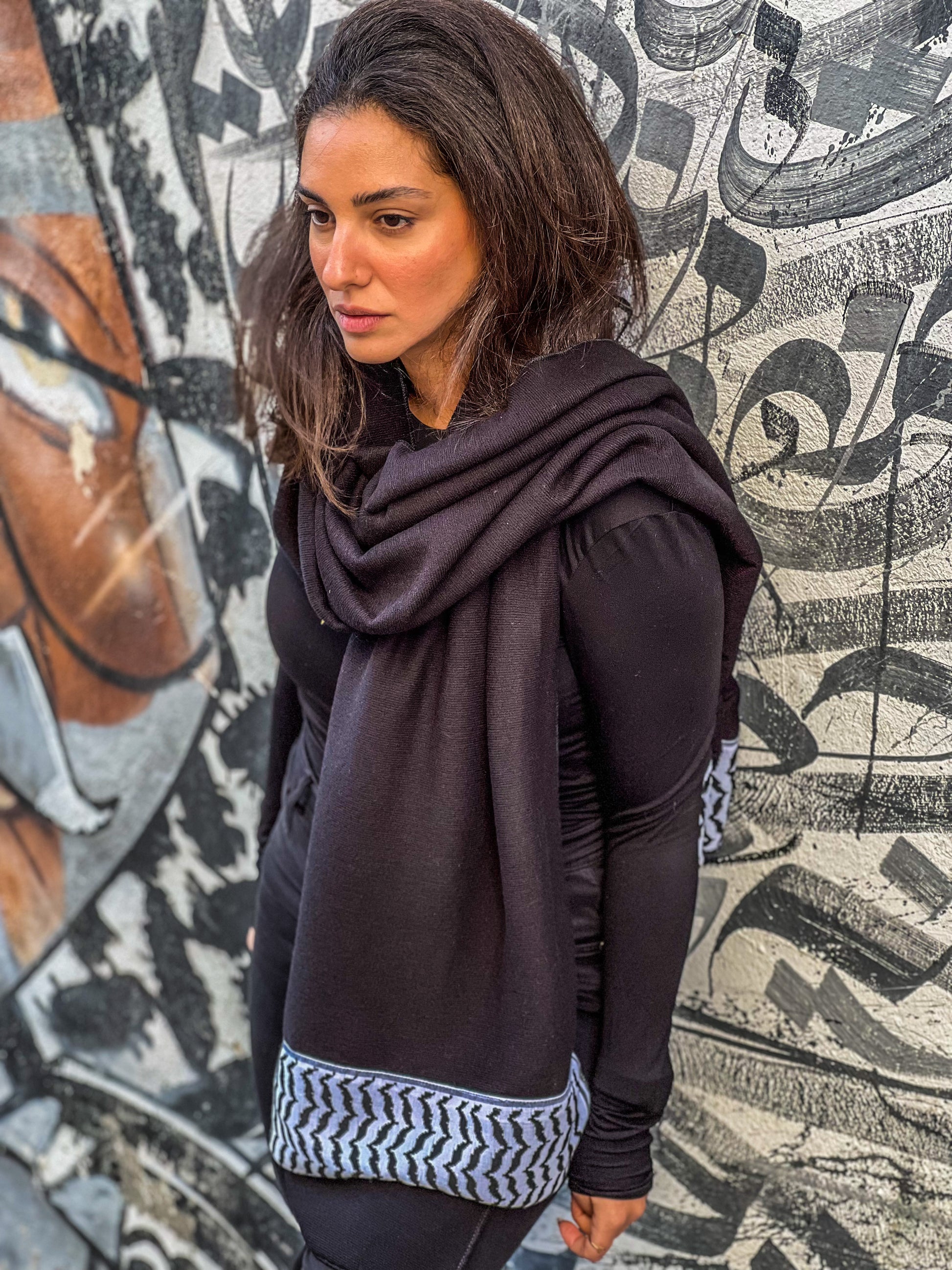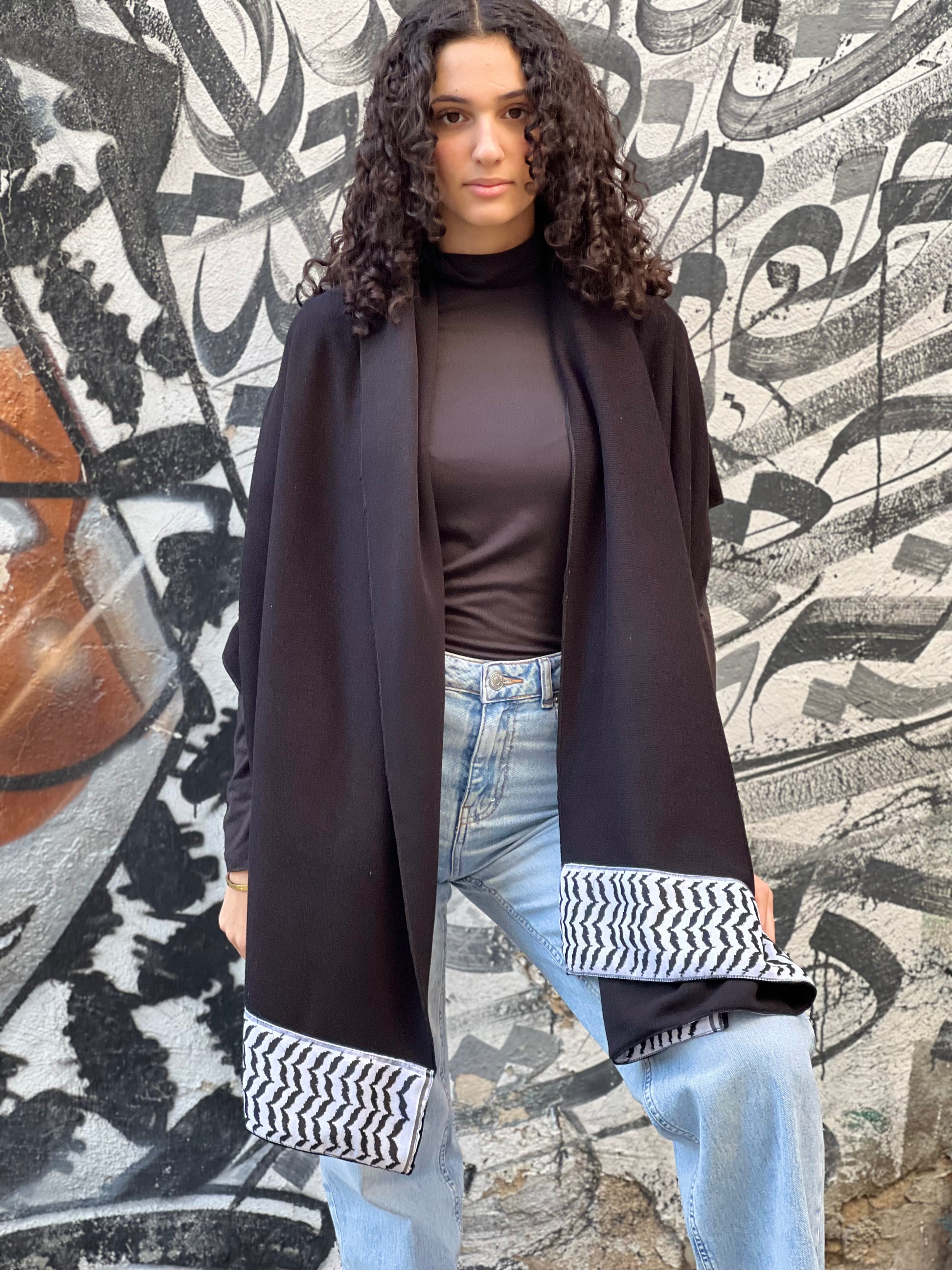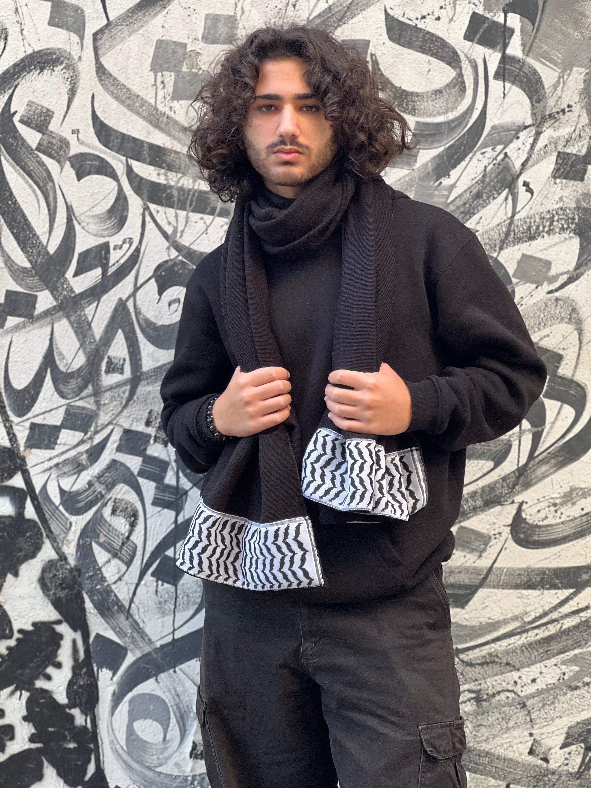 What sets this scarf apart is the incorporation of the Palestinian keffiyeh fabric, a beloved symbol of Palestinian identity and resilience. The intricate patterns and symbolic black and white design of the keffiyeh fabric add a touch of authenticity and cultural significance to the scarf, making it a powerful statement piece.