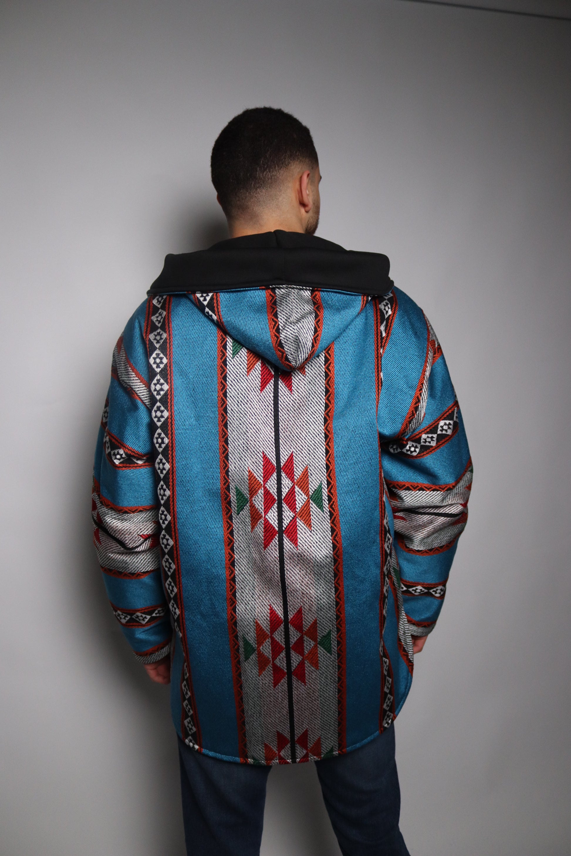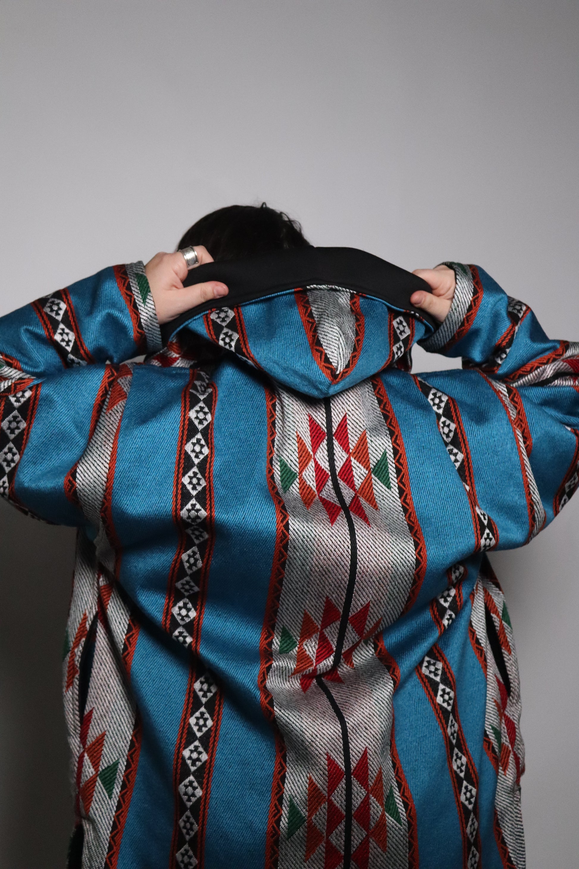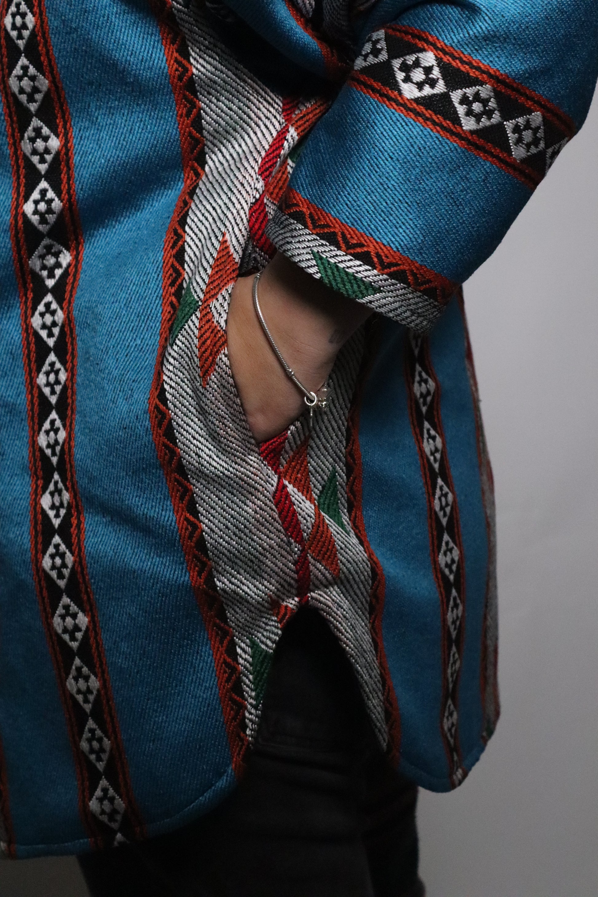 Introducing the Qashabeyyeh Sama Padded Full Zipper Jacket: Unisex Sophistication in a Blue Split Cut Design.