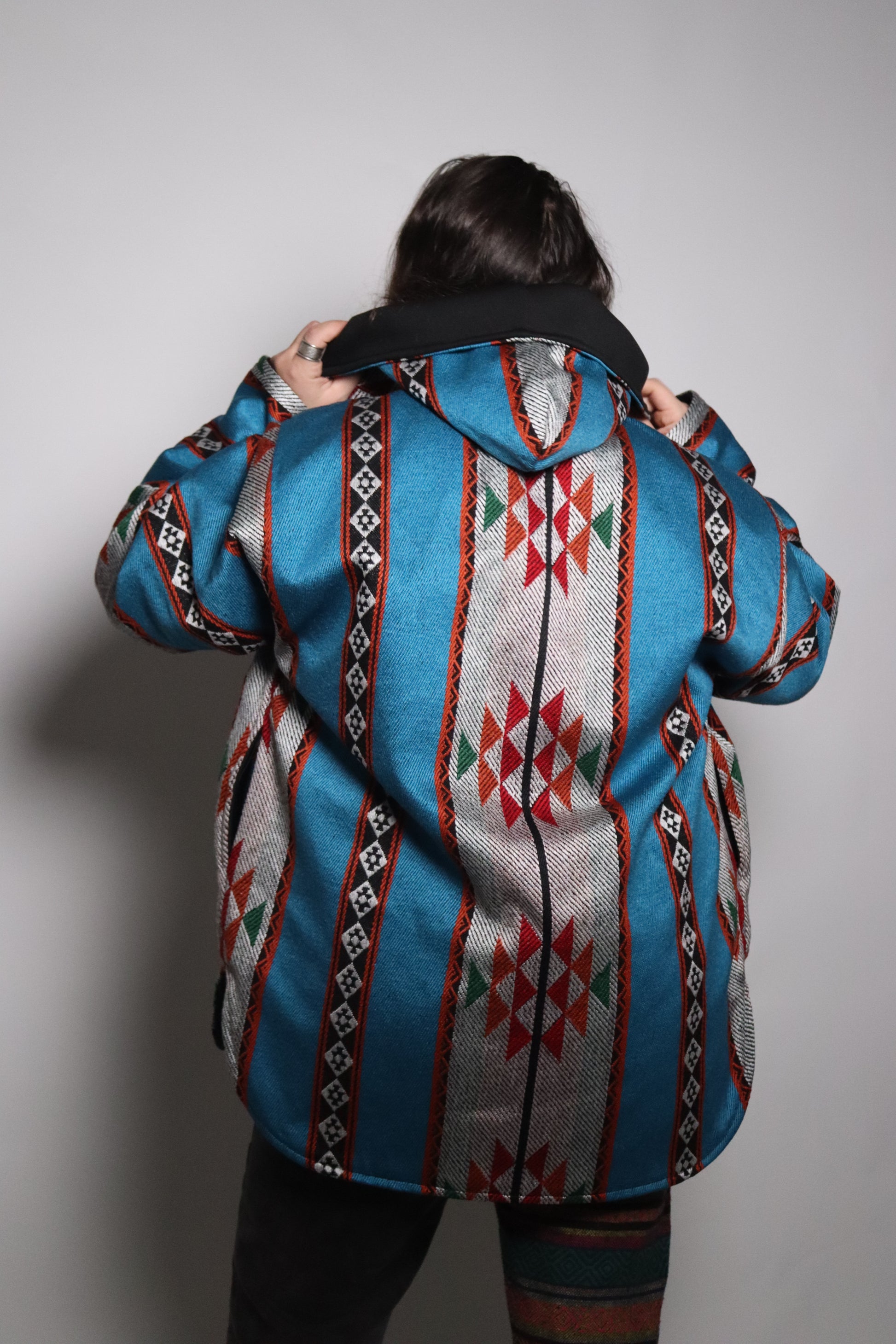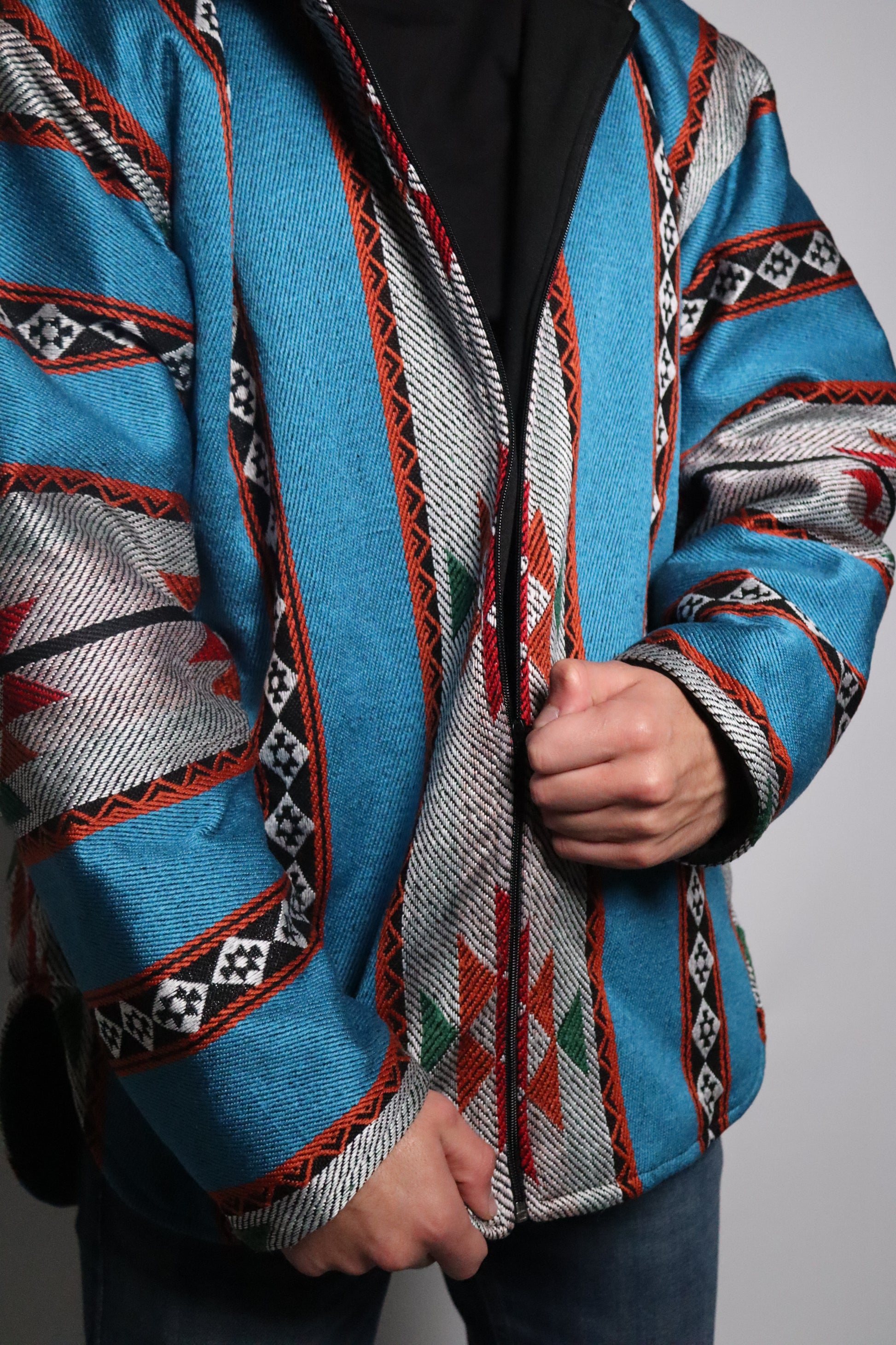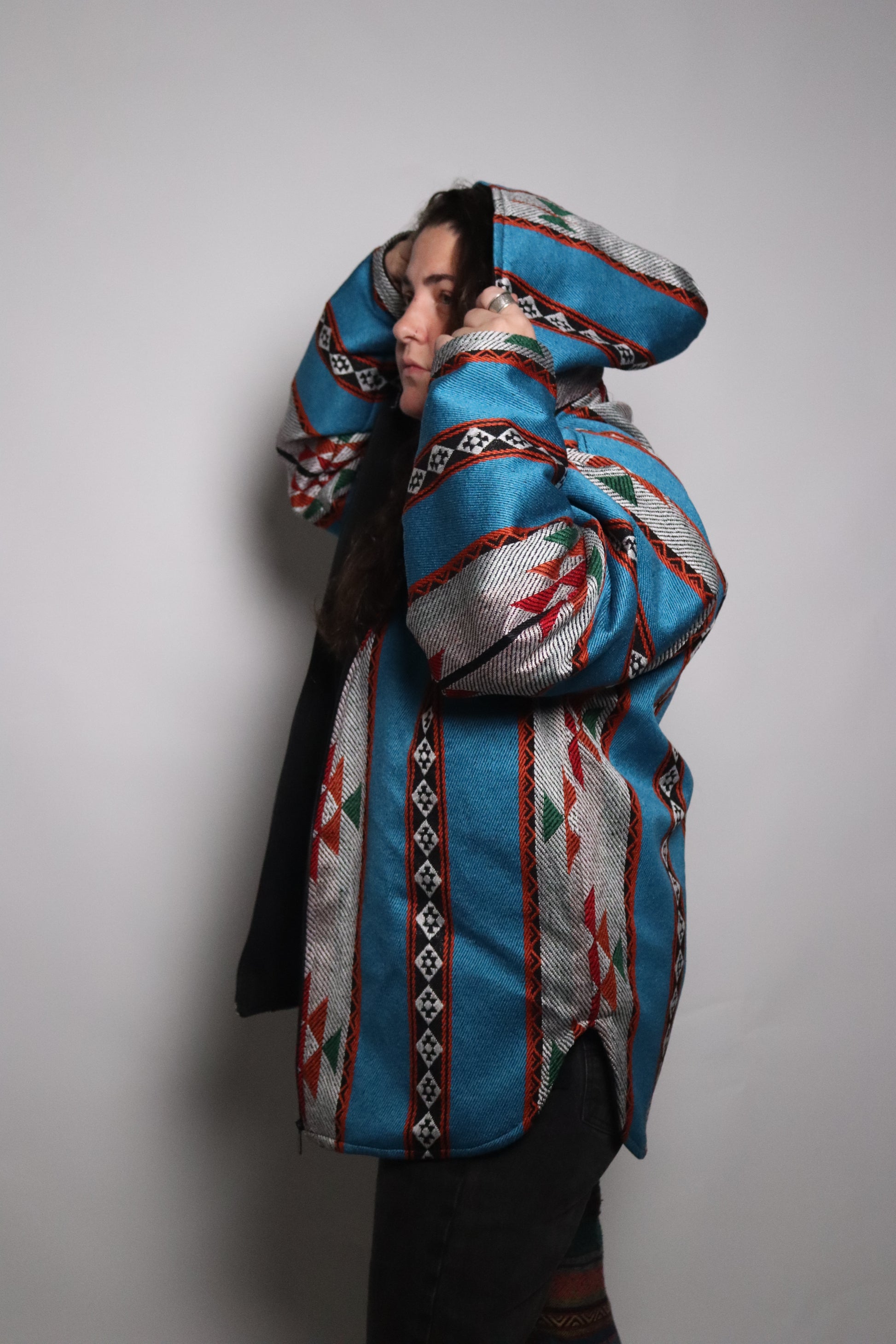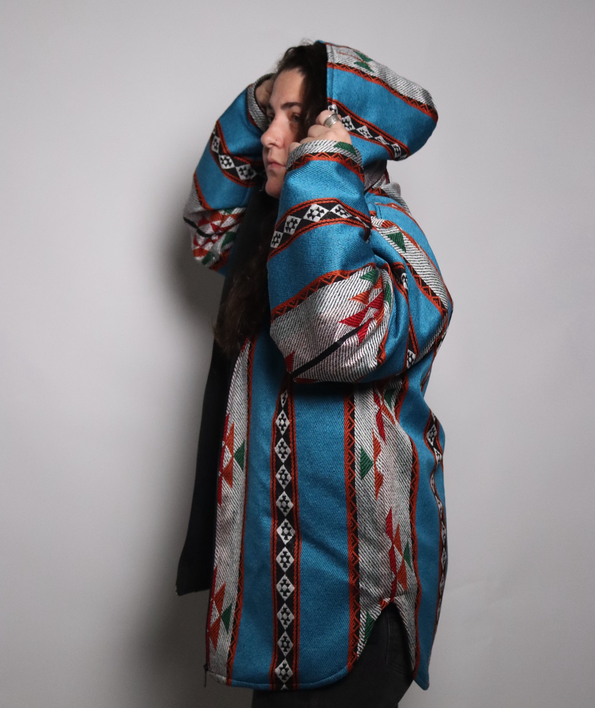 Introducing the Qashabeyyeh Sama Padded Full Zipper Jacket: Unisex Sophistication in a Blue Split Cut Design.