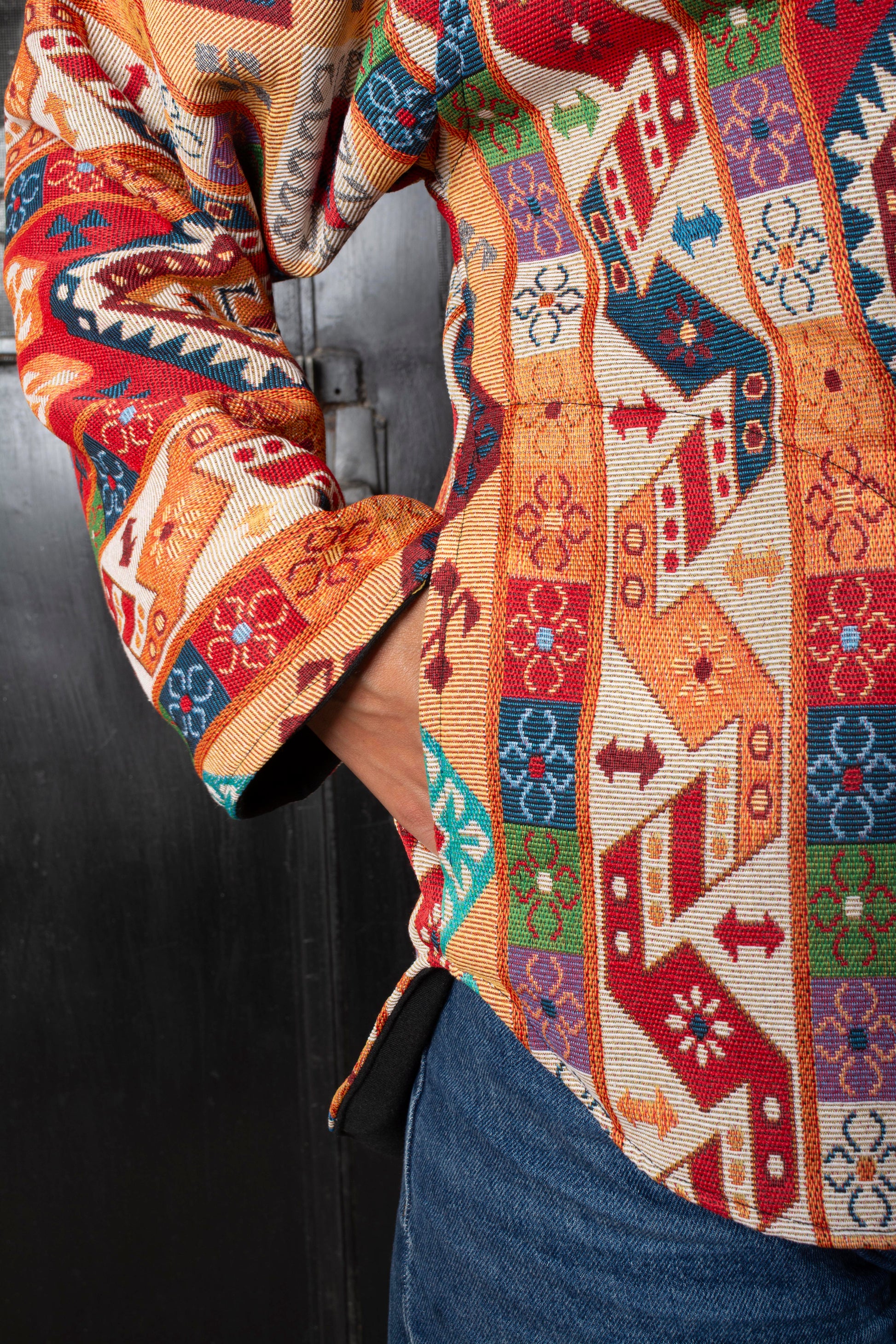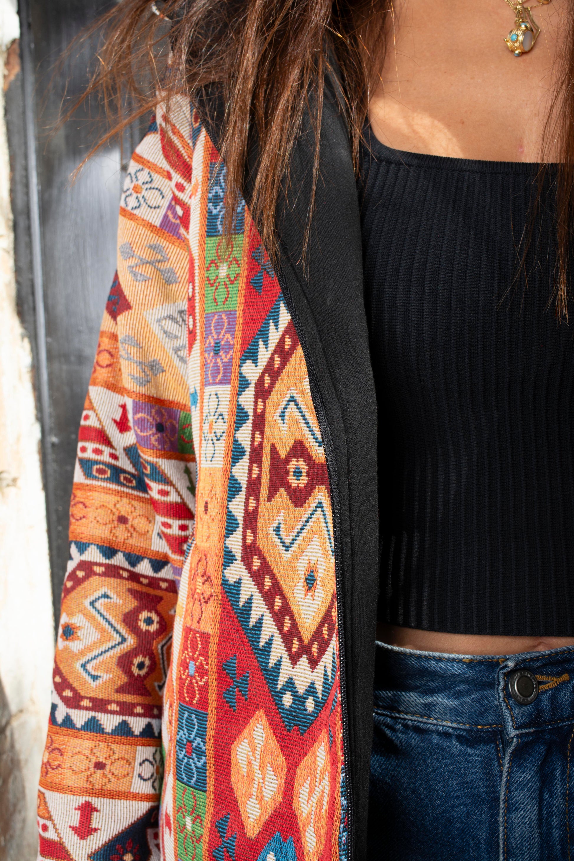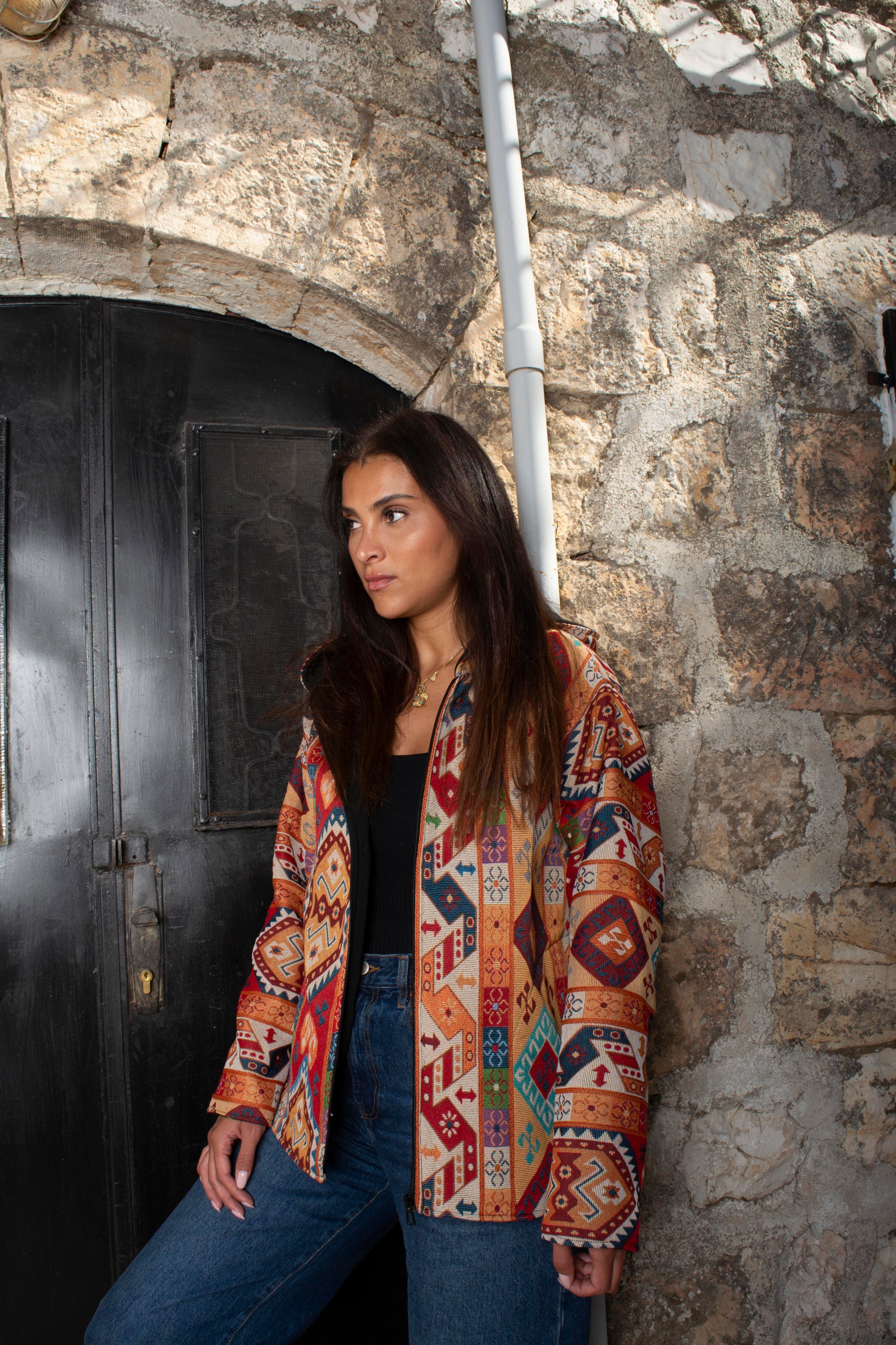 The Shams Thermal Jacket shines in a vibrant mix of orange, yellow, and white, bringing the energy of sunrise to your wardrobe. With warm thermal padding, a split cut, and functional pockets, it’s cozy, stylish, and perfect for chilly days. All sizes available, uniting color, comfort, and versatility.