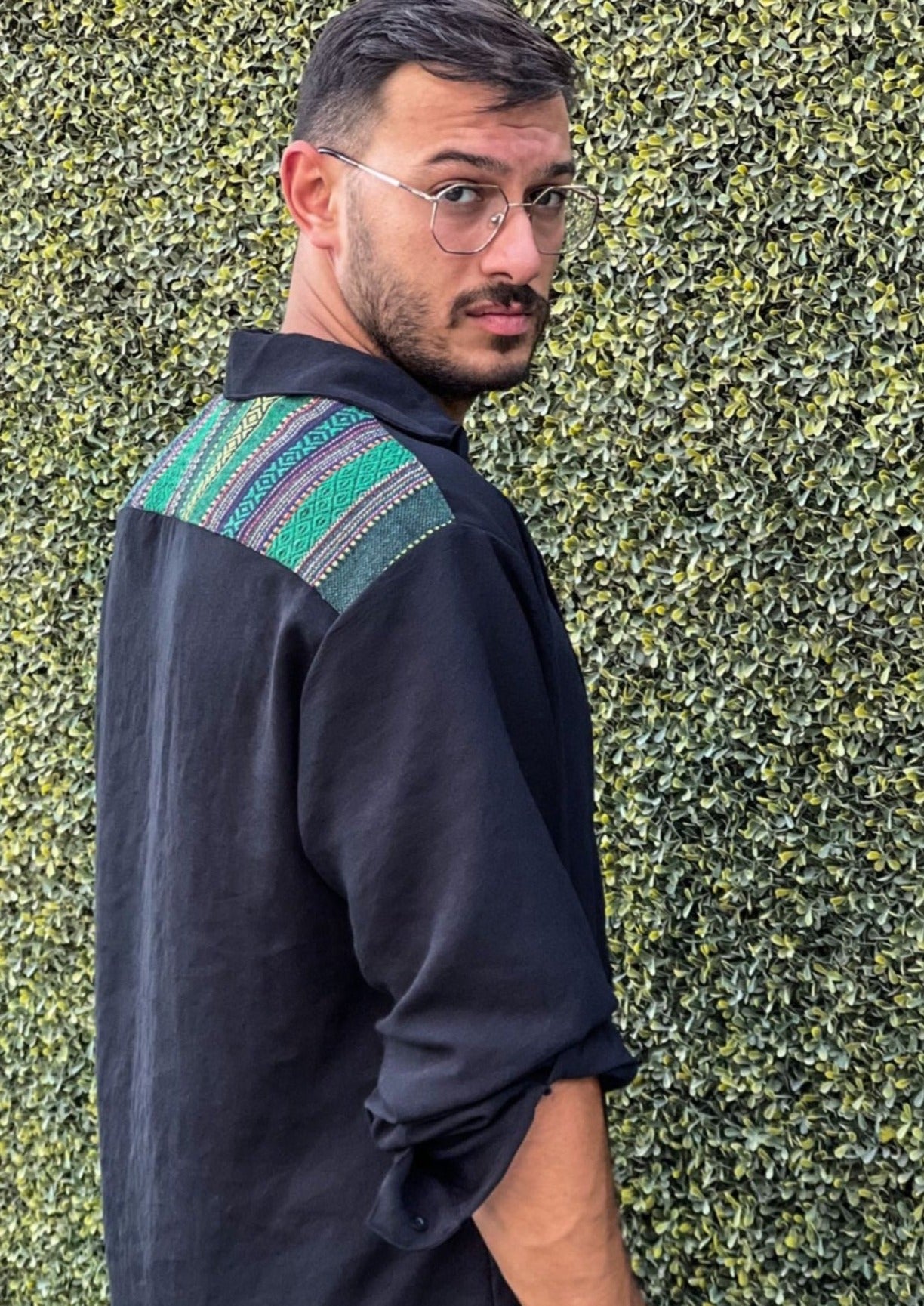 Elevate your style with the Qashabeyyeh Shuja'a on Black Shirt. Order this handmade shirt today and experience the perfect blend of comfort, style, and craftsmanship. Embrace the essence of Qashabeyyeh's designs and make a fashion statement that reflects your unique personality.