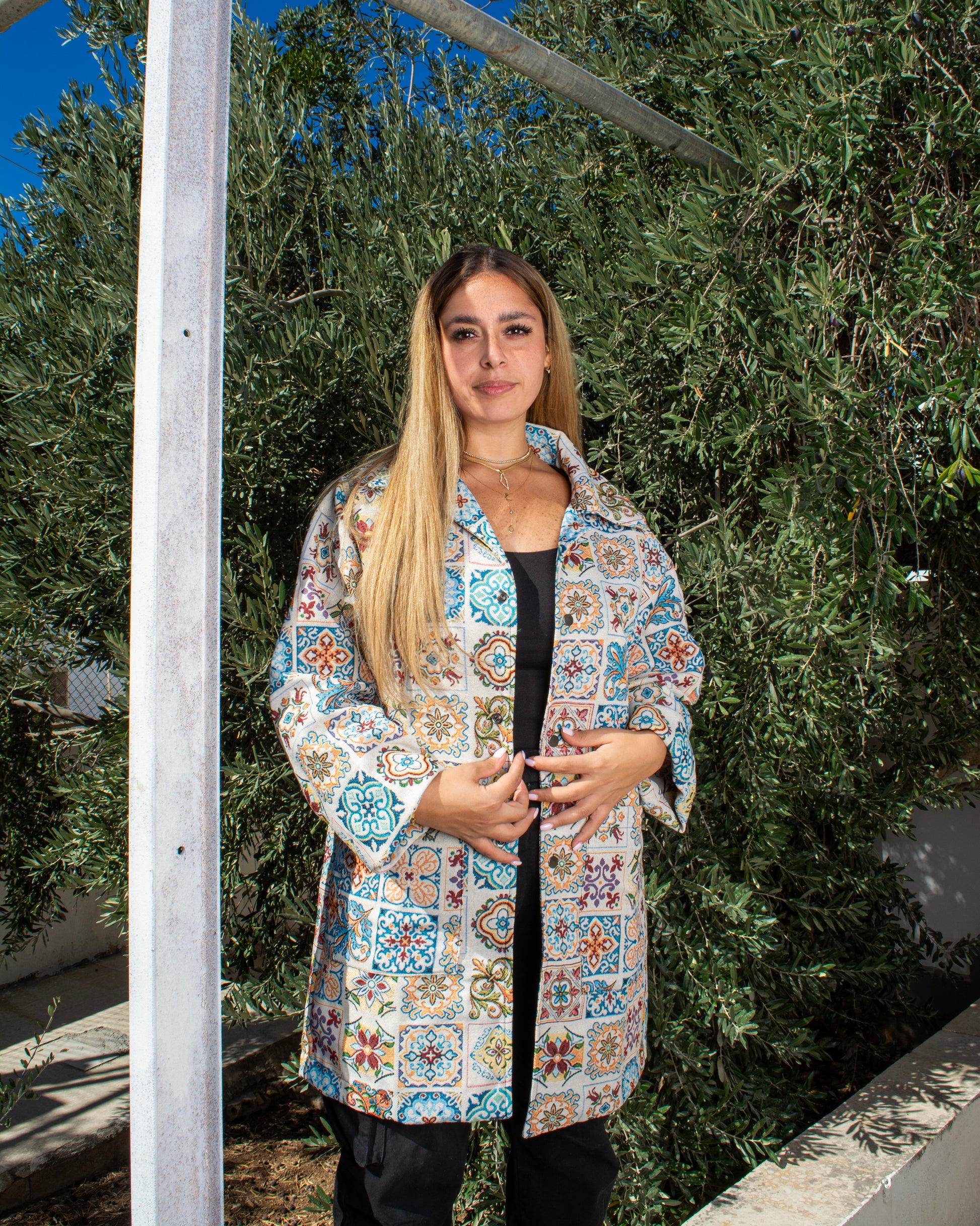 The SITTI Coat draws inspiration from traditional Middle Eastern patterns, blending heritage with contemporary flair. Its intricate, colourful design sits beautifully on a soft, lightweight fabric. This long, unisex coat buttons up neatly, includes two side pockets, and works perfectly for all occasions. With its timeless elegance, the SITTI Coat brings a story of artistry and culture into everyday fashion. Available in all sizes.