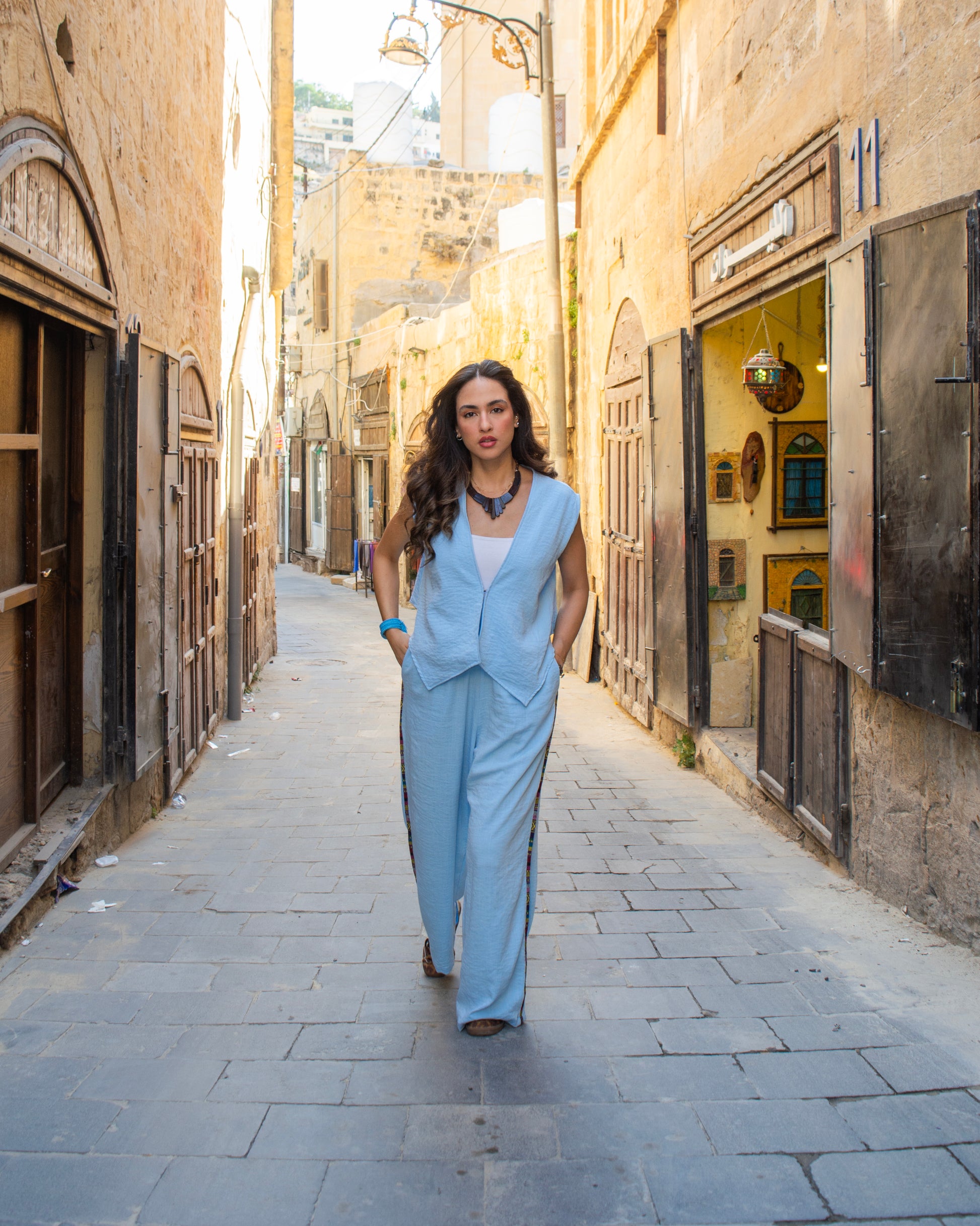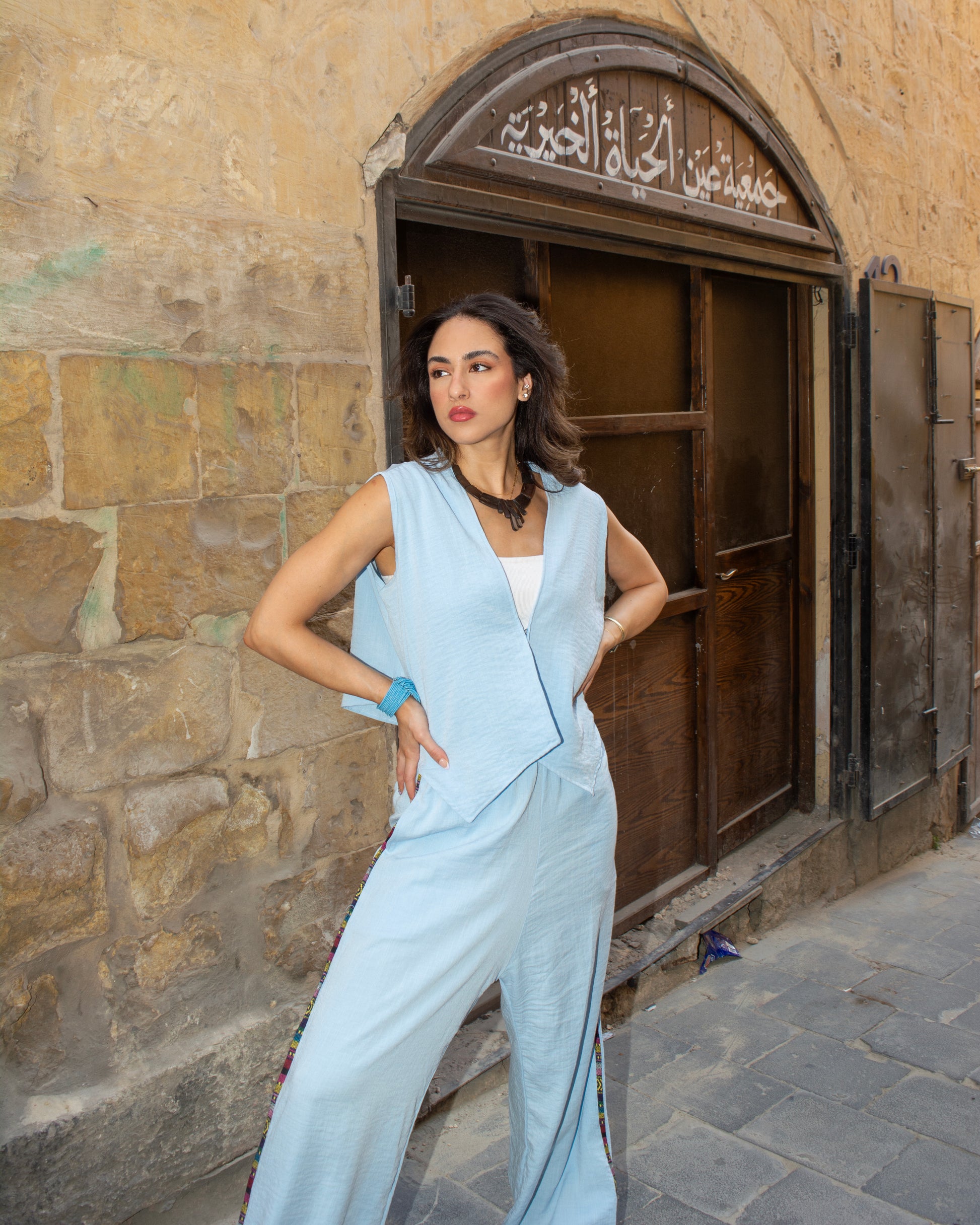 Bathed in a serene baby blue hue, The Icefall Set brings a touch of refined calm to your wardrobe. Its modern silhouette and versatile design make it ideal for everything from casual gatherings to polished workwear.