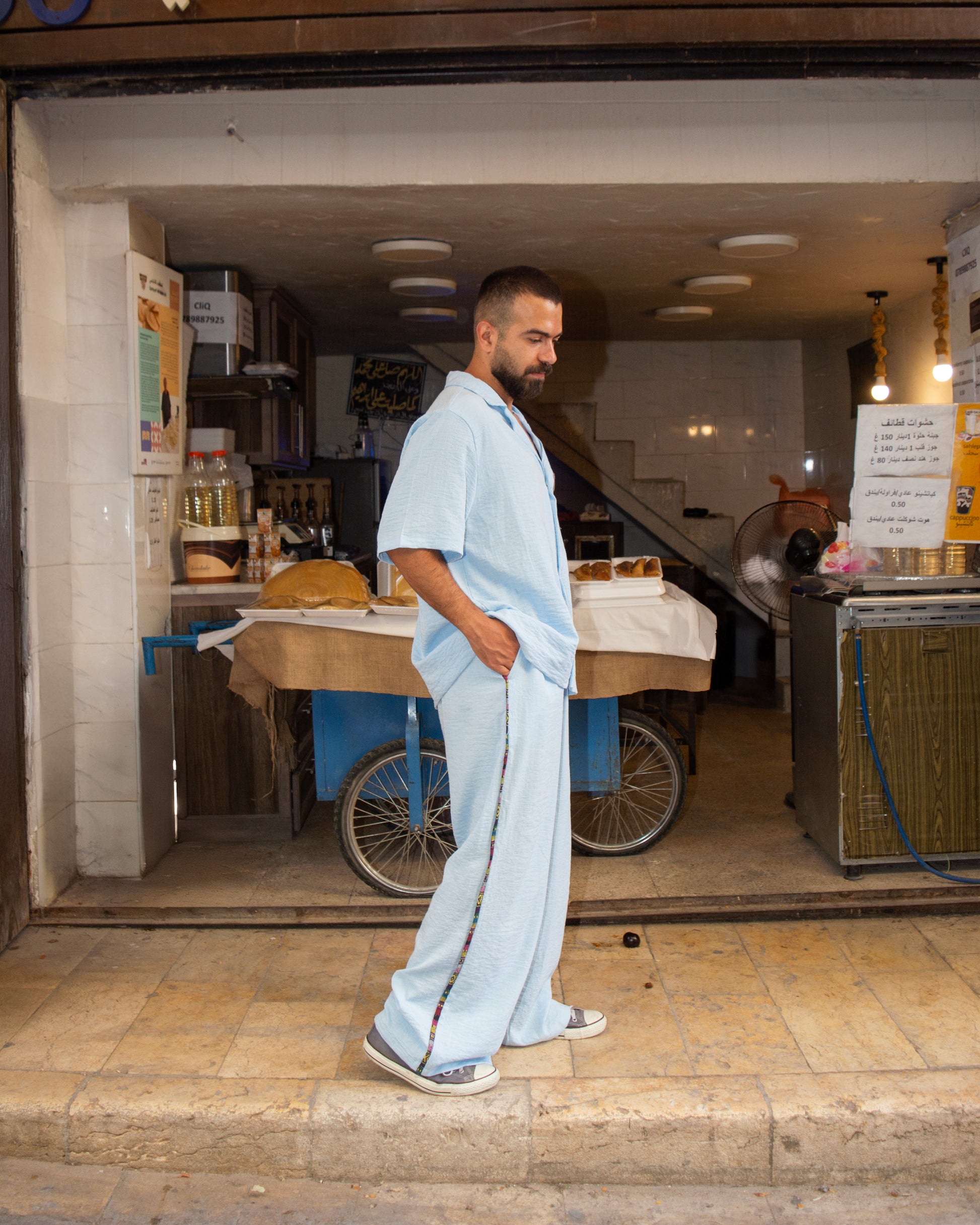 Embellished with Qashabeyyeh’s signature patterned details along the sides, The Ocean Drift Set combines subtle cultural flair with a modern, relaxed silhouette. Perfect for warm days, casual occasions, or laid-back evenings, this set offers versatile style and a comfortable fit designed to move with you.