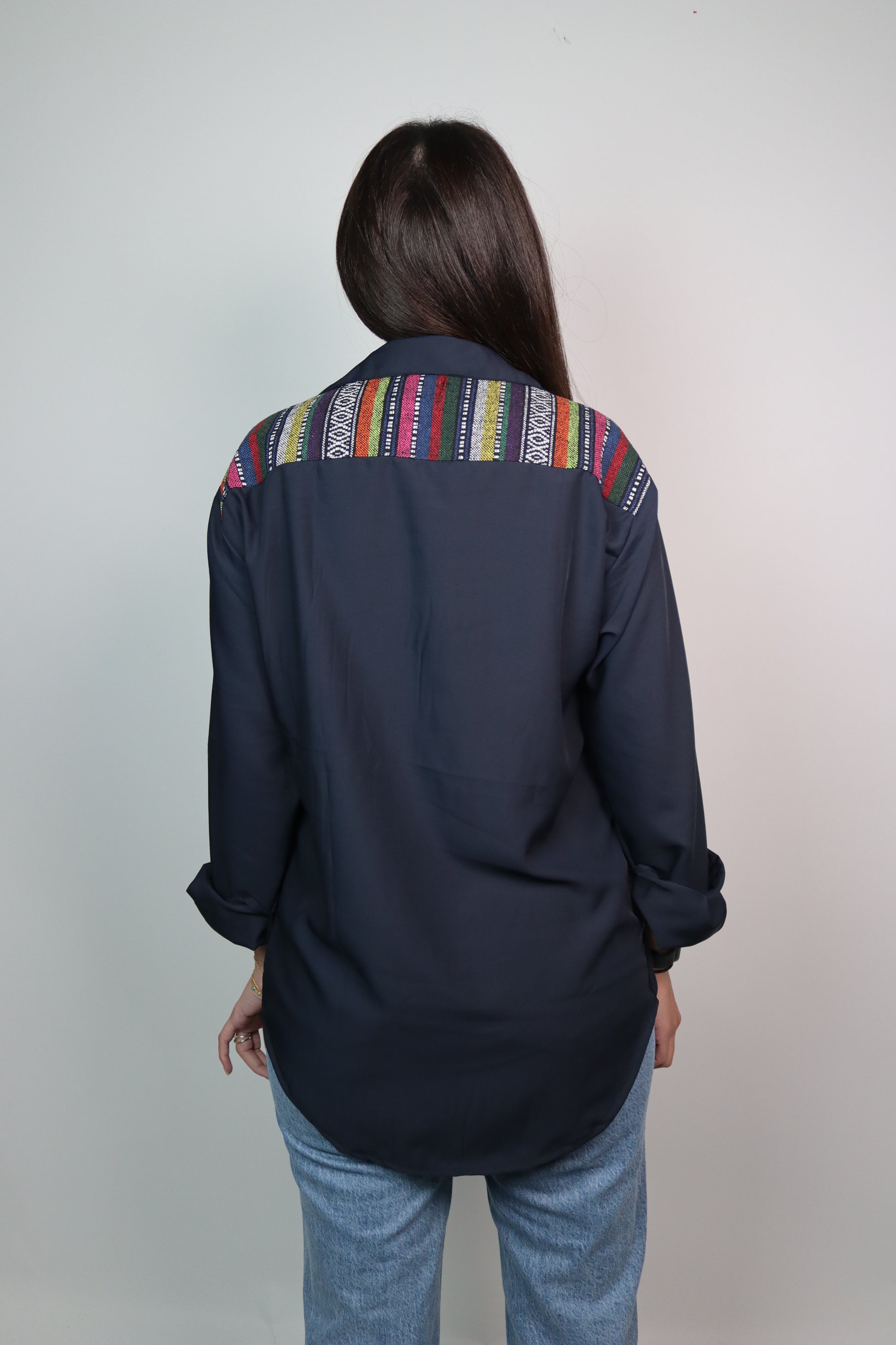 Elevate your style with the Qashabeyyeh Zahi on Navy Shirt. Order this handmade shirt today and experience the perfect blend of comfort, style, and craftsmanship. Embrace the essence of Qashabeyyeh's designs and make a fashion statement that reflects your unique personality.