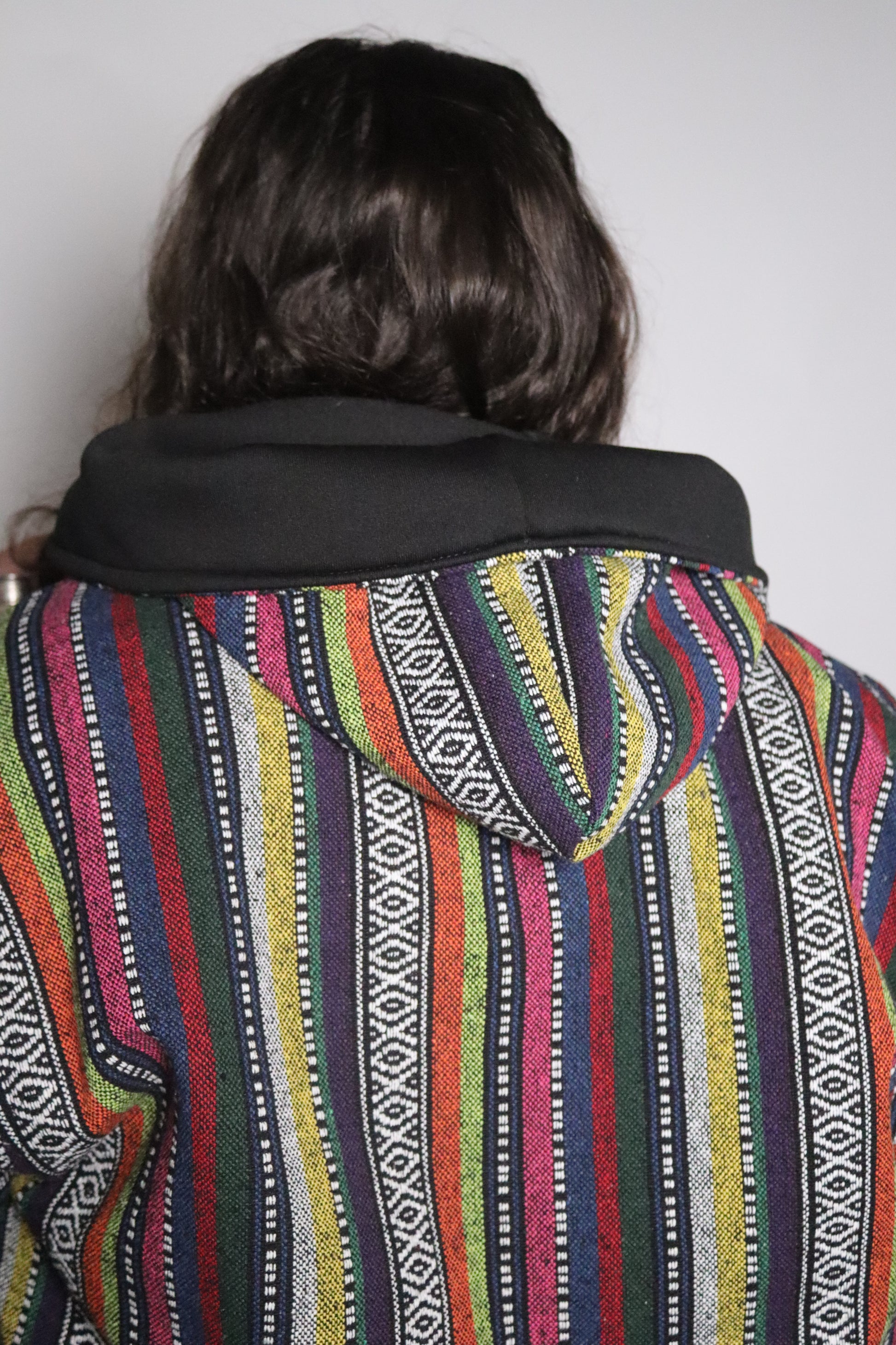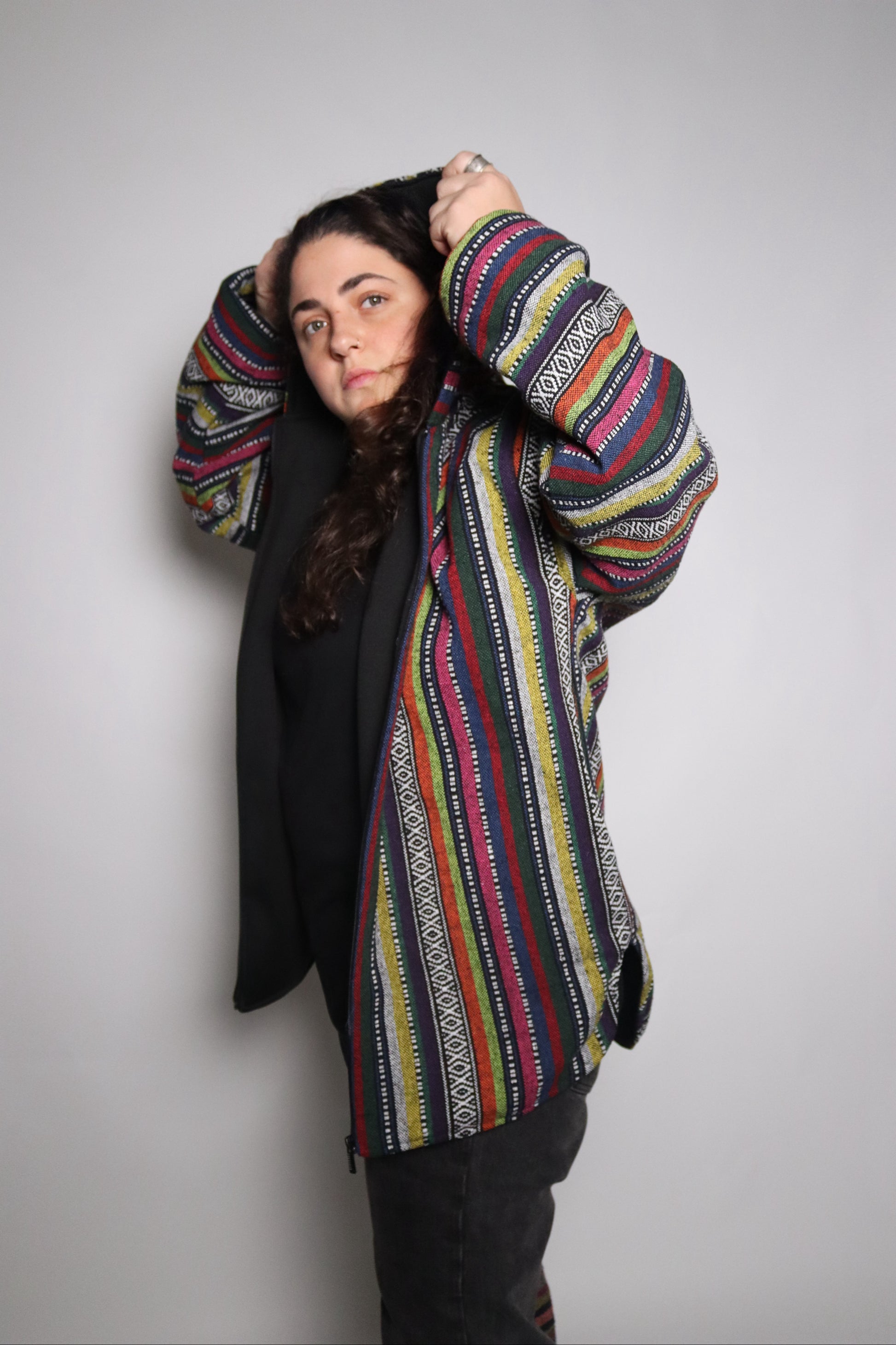 The zahi Full Zipper Jacket from Qashabeyyeh features a stylish split cut design in a vibrant and colorful palette. This unique and eye-catching combination of colors adds a touch of excitement and personality to this already remarkable jacket.